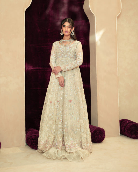 Tulle net kali-daar featuring a flowy, exaggerated flare with a structured bodice and full-fit sleeves,...