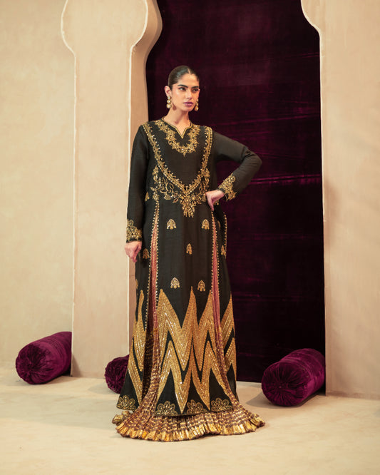 Black silk choli with seehsa and silk thread embroidery. Sleek cut skirt lame' tissue gharara...