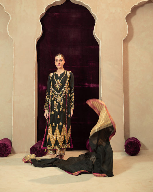 Fabric: Soft – Pure Khaddi Cotton SilkCut: Sleek straight with high side ventsSleeves: BellColor: Black...