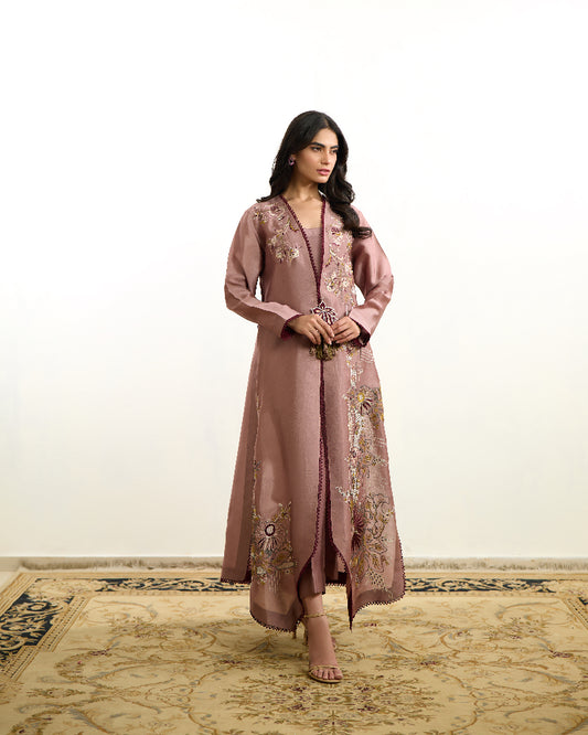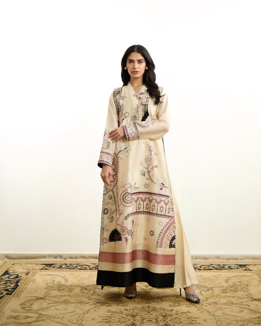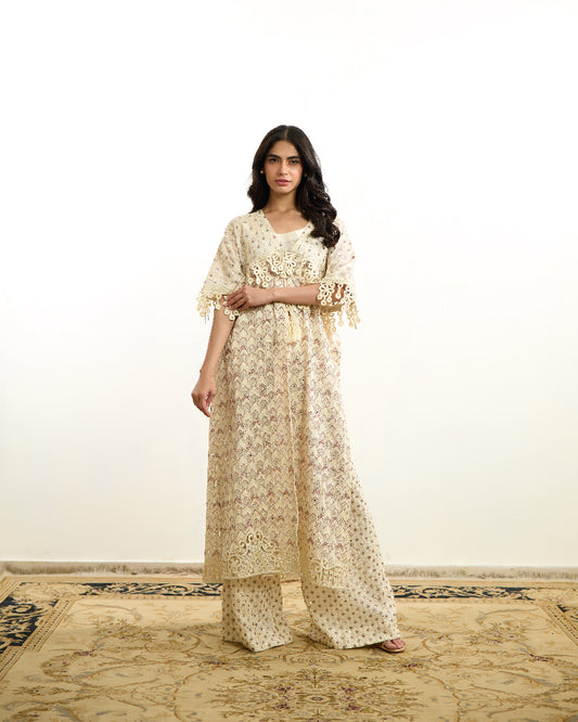 A front-open georgette kaftan with wide elbow-length sleeves, layered over a short undershirt and paired...