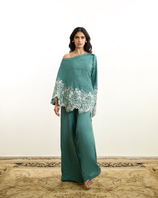 An asymmetric top crafted in textured crepe silk, featuring a cape sleeve on one side...