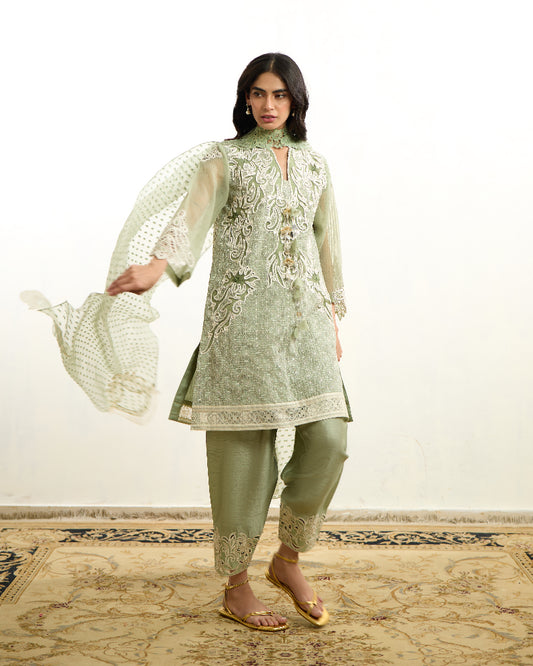A knee-length straight-fit kurta with three-quarter sleeves, paired with a sleek silk shalwar and a...