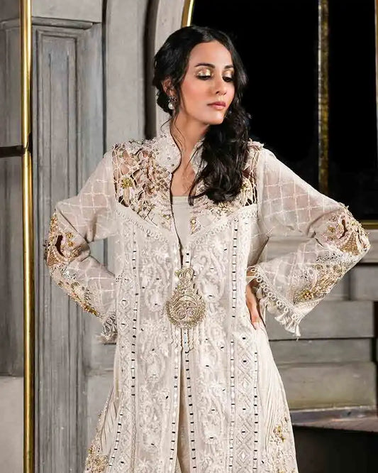 This ivory and gold ethnic wear consists of a silk Khaddi net A-line floor length...