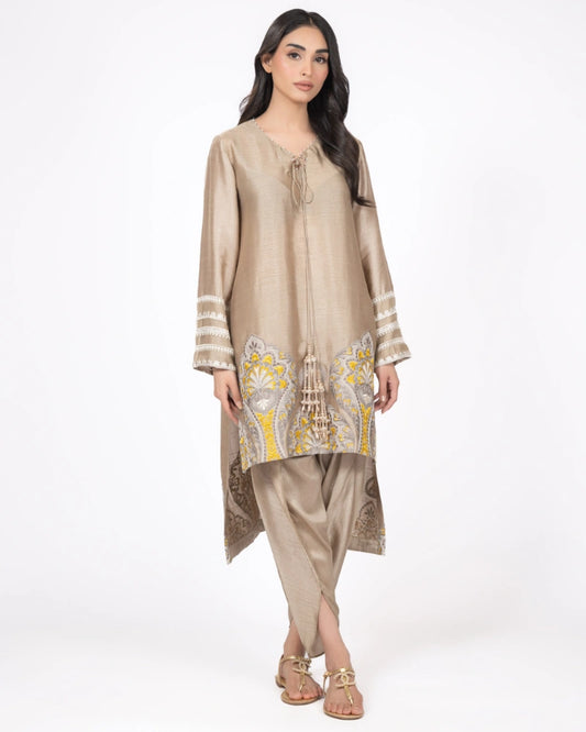 Fabric: Textured Silk Matching SeparatesCut: Straight Fit, Asymmetric Length Shirt | Tulip PantColor: Taupe Base...