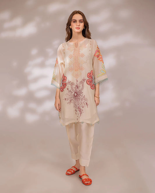 Fabric: Pure voil lawn Cut: Box kurta Color: Ivory Detailing: Multi color silk thread embroidery...