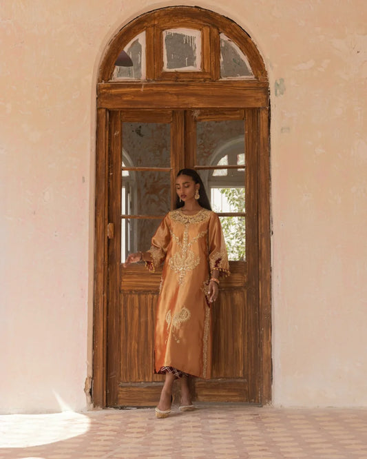 A sleek straight pure organza & silk shirt intricately embroidered & appliquéd with delicate cutwork....