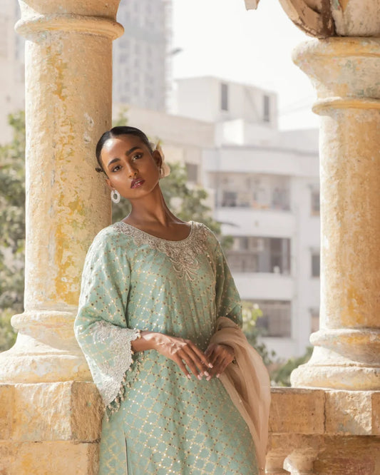 A breezy leather cutwork top with pleated shalwar pants adorned with delicate touches for a...