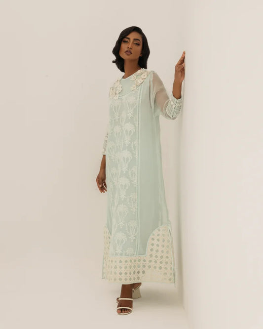 Fabric: Pure organza Cut: A-line long shirt Color: Aqua ferozee with off white embroideries and...