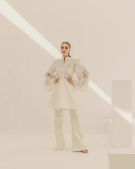 Fabric: Pure silk & pure organza Cut: Peplum flare jacket Color: Milky white Detailing: Dorri...