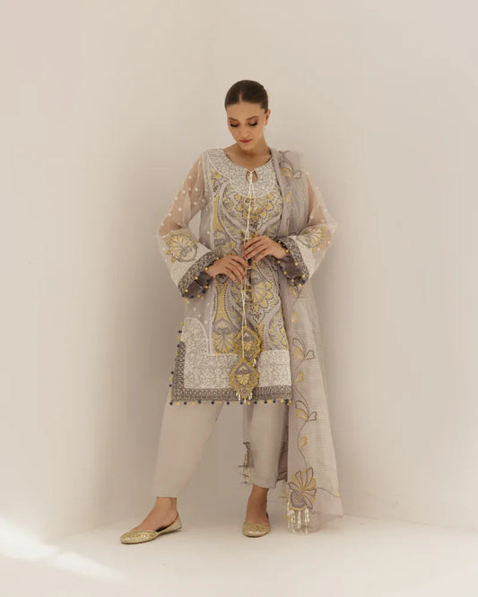 Fabric: Pure organza Cut: Long relaxed fit Kurta with short side slits & a Hyderabadi...