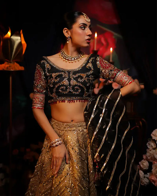 Black silk zardoze worked choli with Jewelled tassels on back. -Bronze gold lame lehanga with...