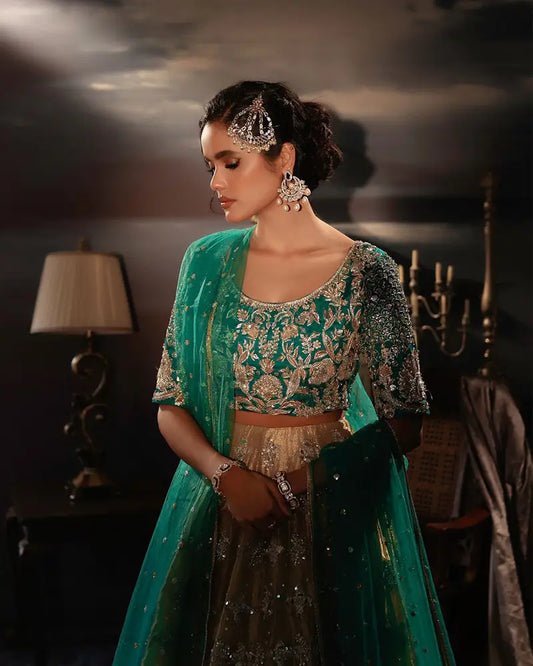 Deep peacock green embellished choli with peacock motifs on sleeves enhanced with an intricate cutwork...