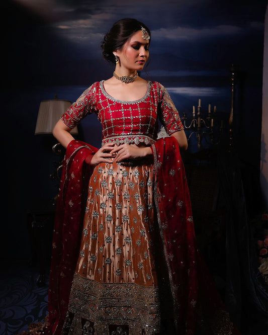 Flowy net paishwaas cladded with ganga jamni kaamdani. The grand ghaira is heavily worked with...