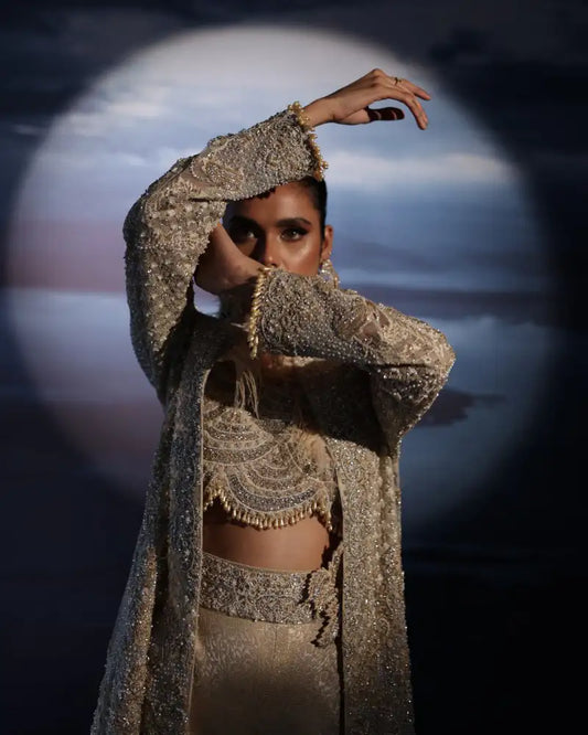 All over handworked jewelled front open jacket. Pearl & crystal embelished handwork cropped slip, silk...