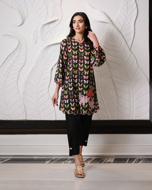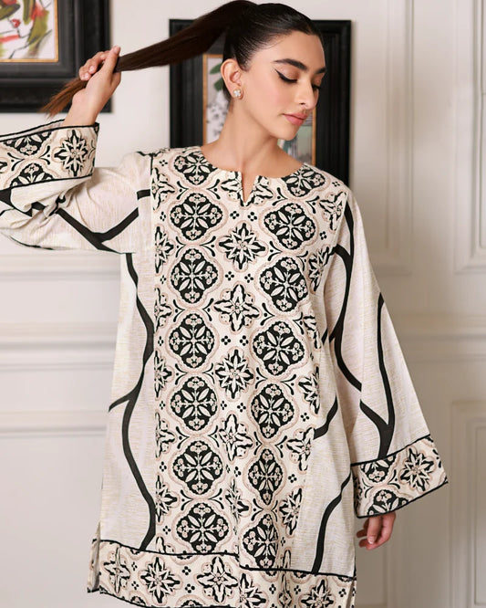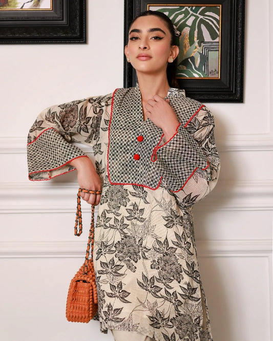 The allure of mono chrome with exquisite embroidery neck detailing. This enchanting ensemble, crafted from...