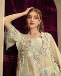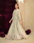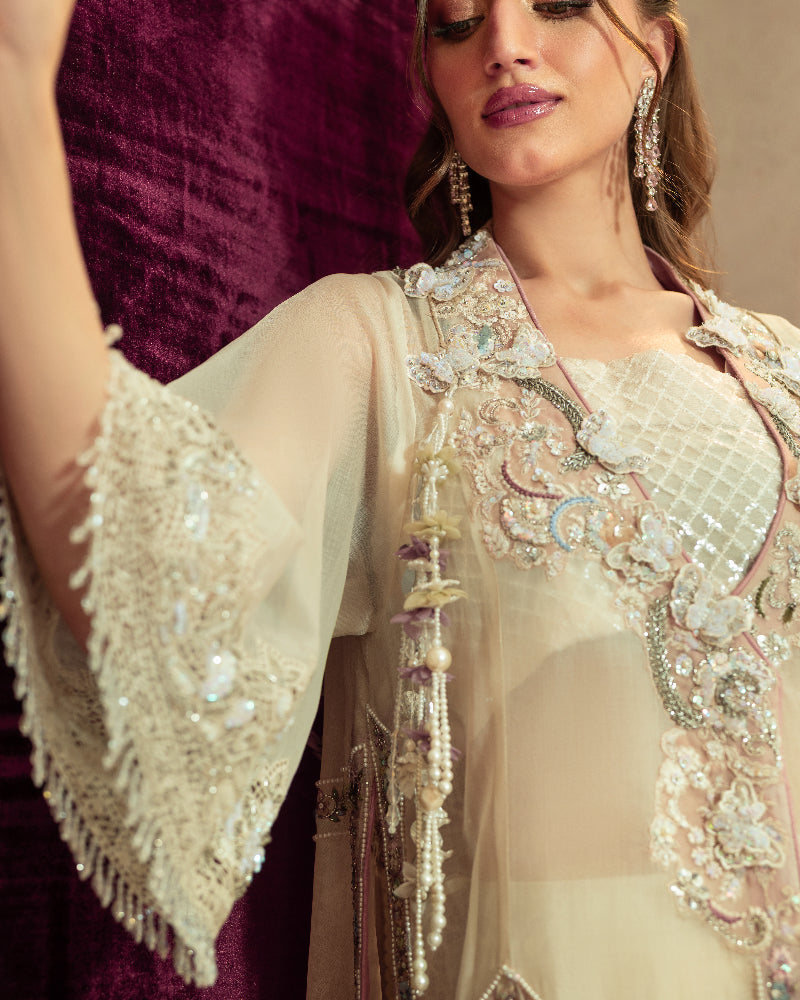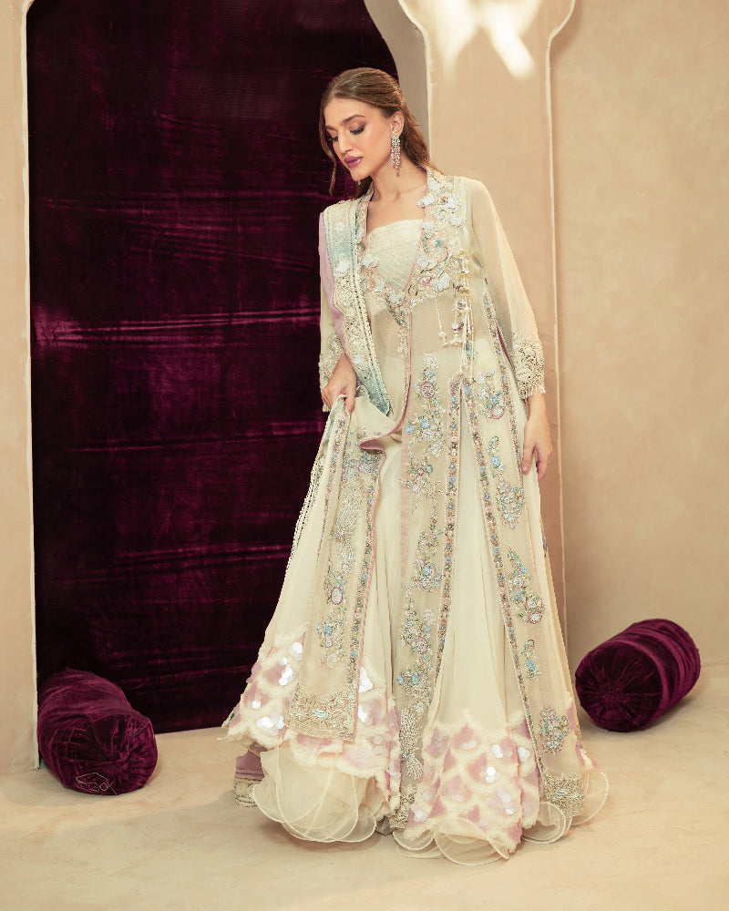 Pure kataan organza shirt, paired with a chiffon flared lehenga skirt and a sheer silk organza dupatta. An ivory ensemble with delicate hints of pink and soft blue, hand-embroidered with handworked 3D butterflies and florals, finished with handmade tassels, pearls, sequins, and intricate zardoze work. Dupatta features a four-sided cutwork embroidery border.