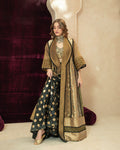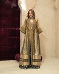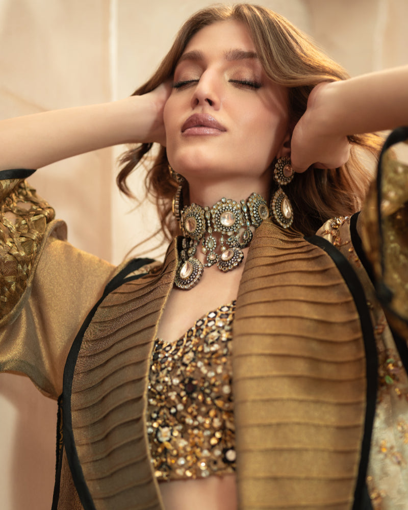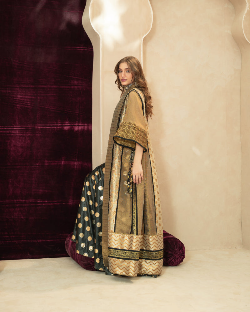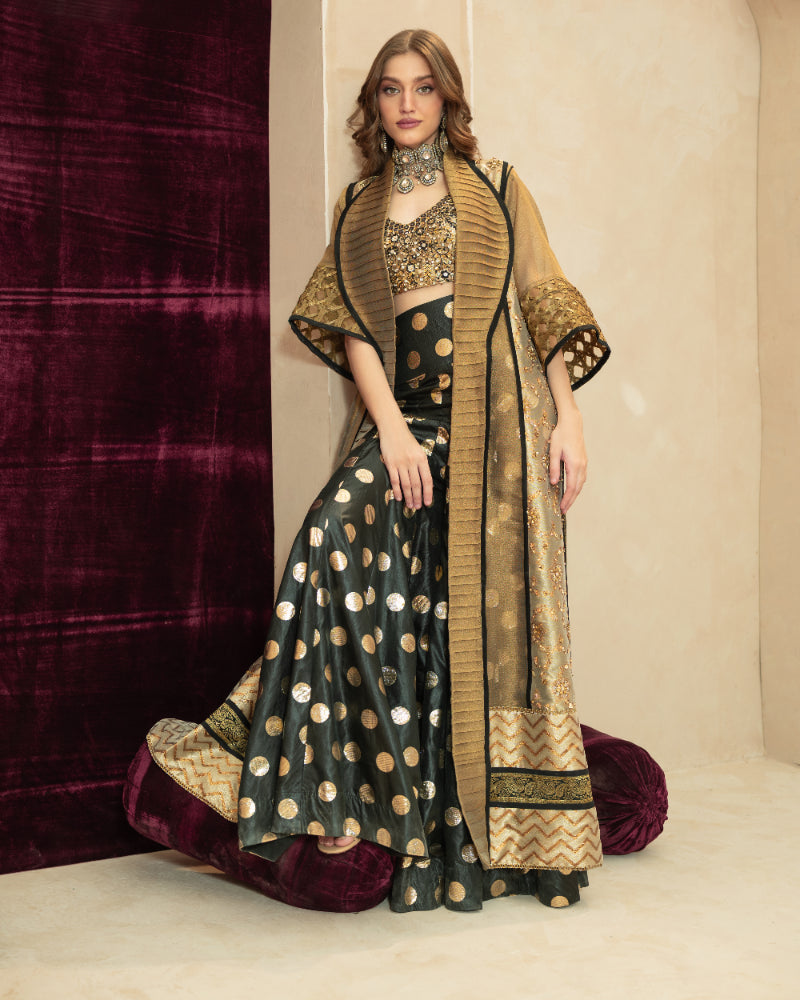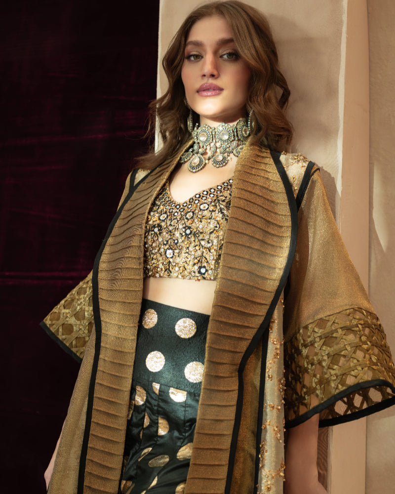 Flowy panelled, front-open flare jacket paired with a cropped inner top and flowy wide-leg Dhaka pants for an effortlessly regal silhouette. A striking mix of bronze-golds and black, elevated with hand-embroidered woven panels and impactful folded grand collars that frame the look beautifully. Finished with dramatic bell sleeves featuring an intricate hand-weaved pattern. Paired with banarsi polka dot silk–based wide-leg, flowy Dhaka pants to complete the statement set.