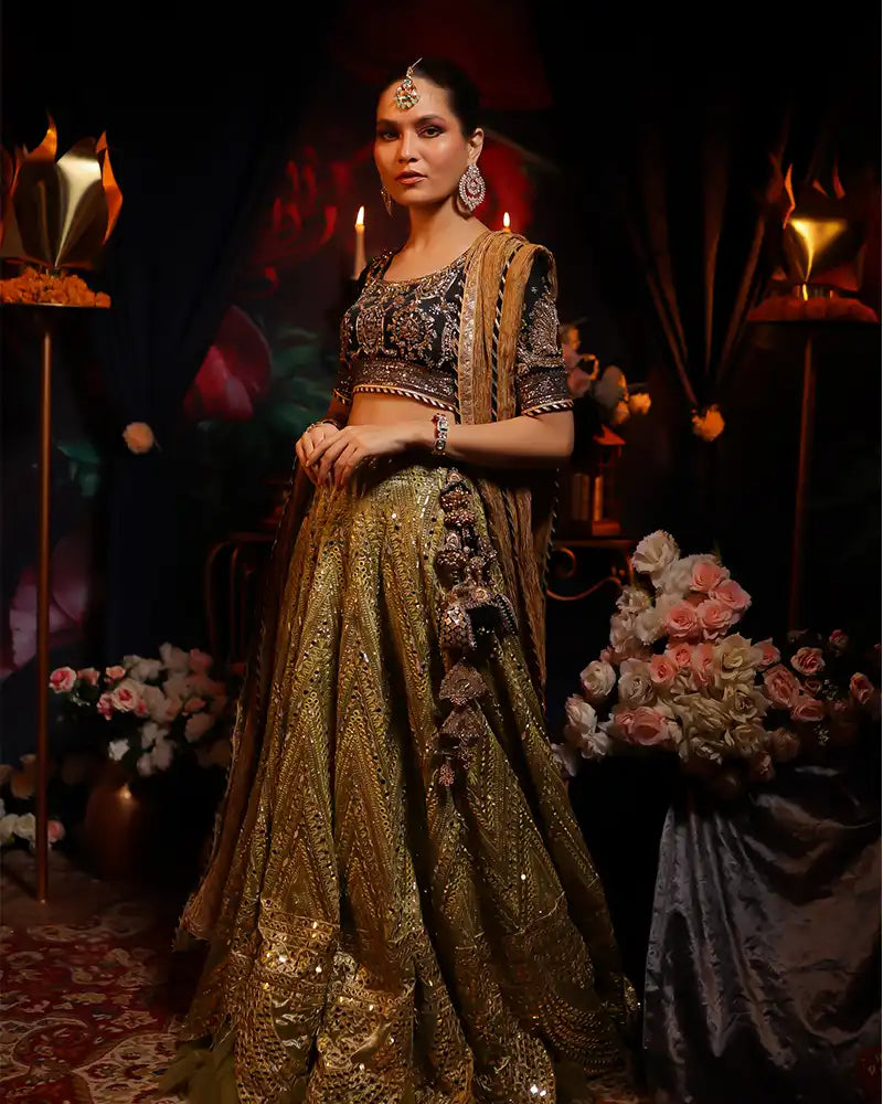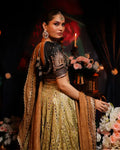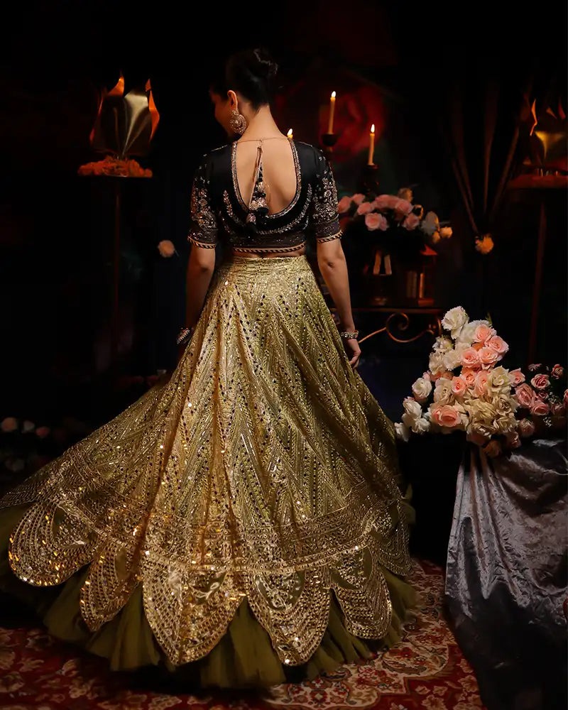 Black silk zarzode worked choli with jewelled tassels on back -chartreuse lamey lehanga with zari embroidery& seesha -crushed metallic gold 3.5 yards duppata finished with black and gold gota.