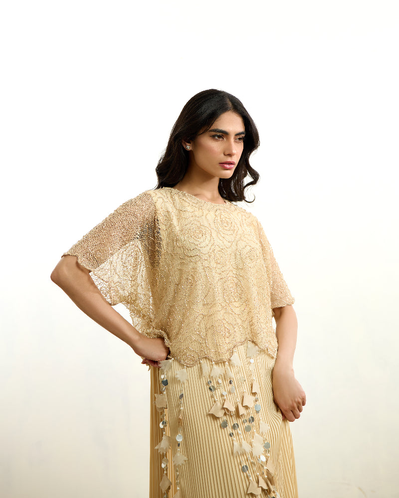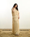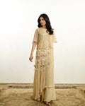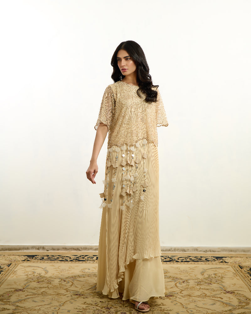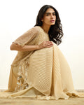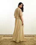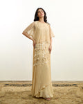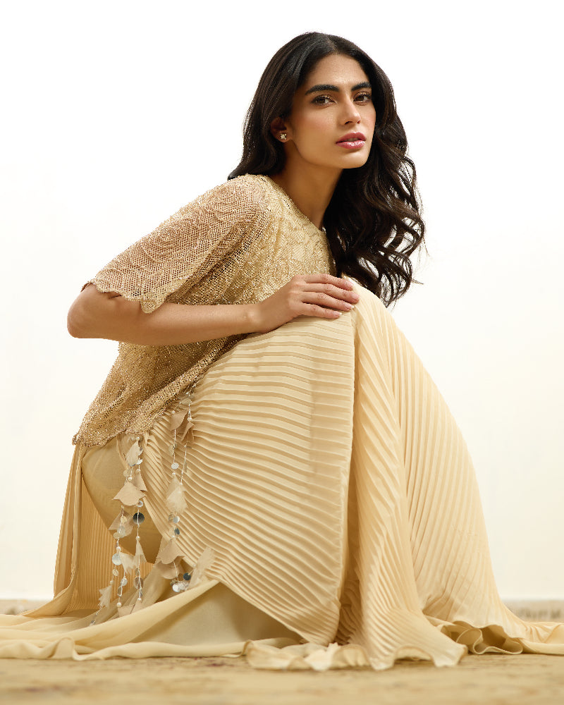 AREEJ-NOIR in beige is a timeless embodiment of modern sophistication, crafted in a soft, classic hue. This layered chiffon dress features delicate pleats that create graceful movement, offering fluidity with every step. Paired with a beautifully crafted net top adorned with intricate glass beadwork, the ensemble strikes the perfect balance between structure and sheer elegance. Handmade tassel accents add a signature artisanal touch, enhancing its refined, yet statement-making appeal.