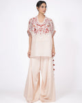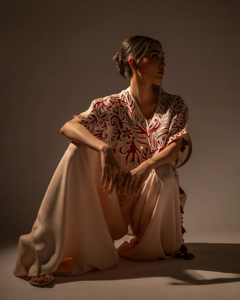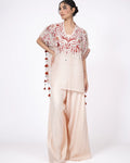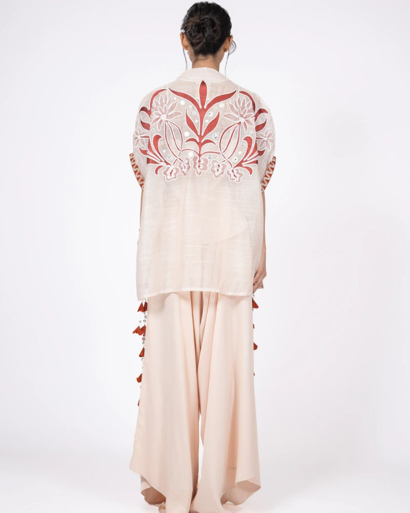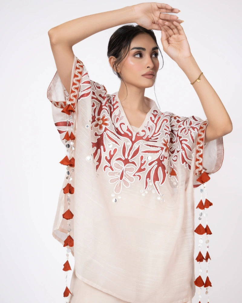 A blush peach ensemble adorned with bold sheesha and dorri embroidery in brick red, finished with handmade tassels. The intricate work extends front and back, offering a perfect blend of tradition and contemporary charm.