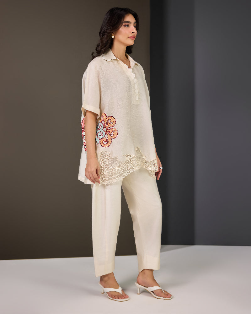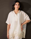 Delicate cutwork embroidery traces the hemline, while embroidered motifs adorn the sidesāfront and backāadding refined detail and depth to the deep ivory canvas. Every element speaks of quiet sophistication.