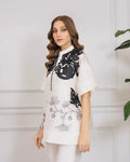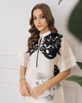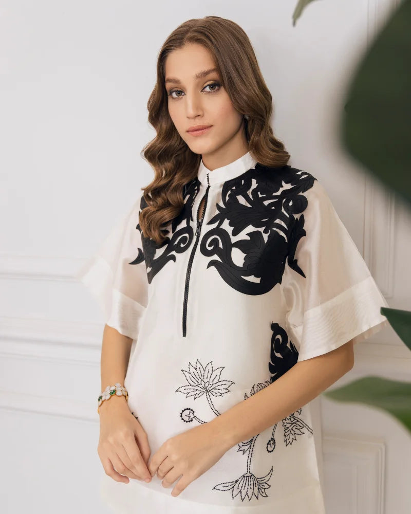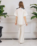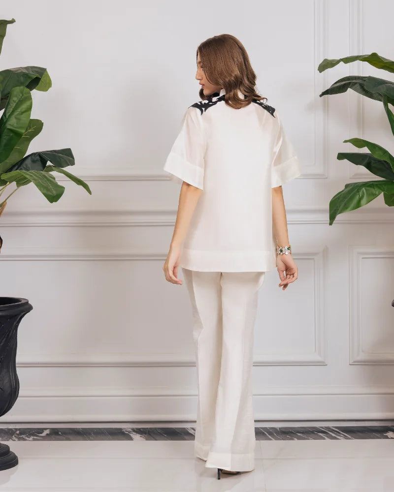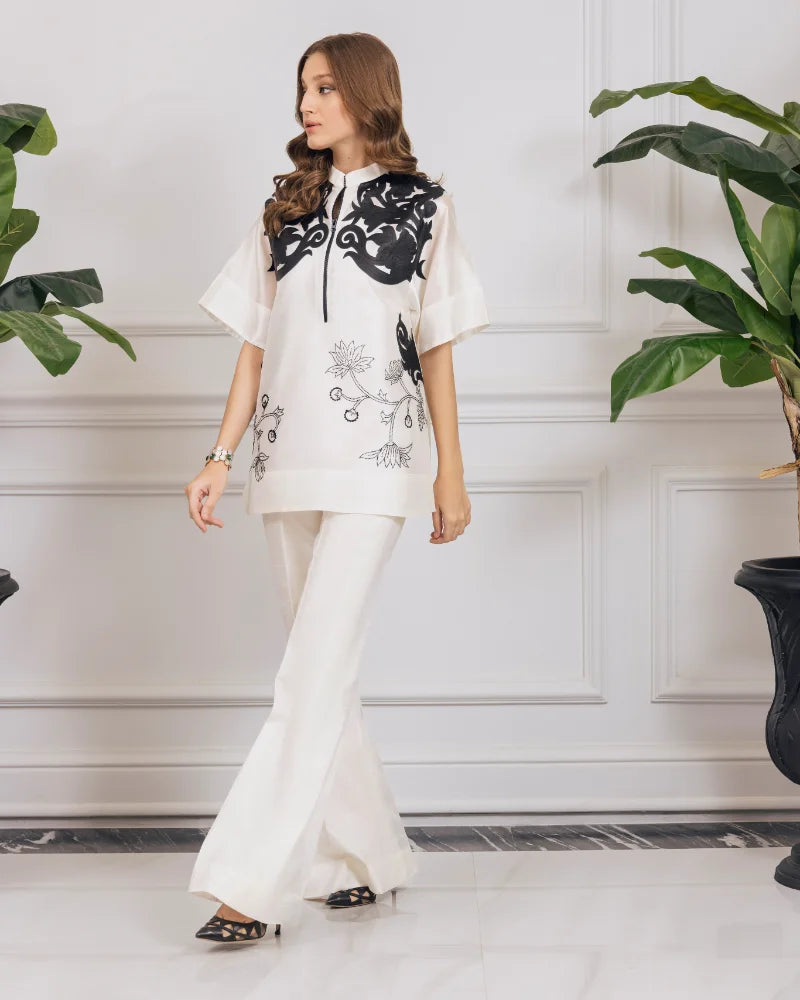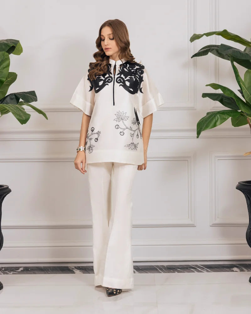 A stunning co-ord set that combines the allure of leather cutwork with a touch of unique style, with intricate embroidery on top, and elegant boot cut leg pants.