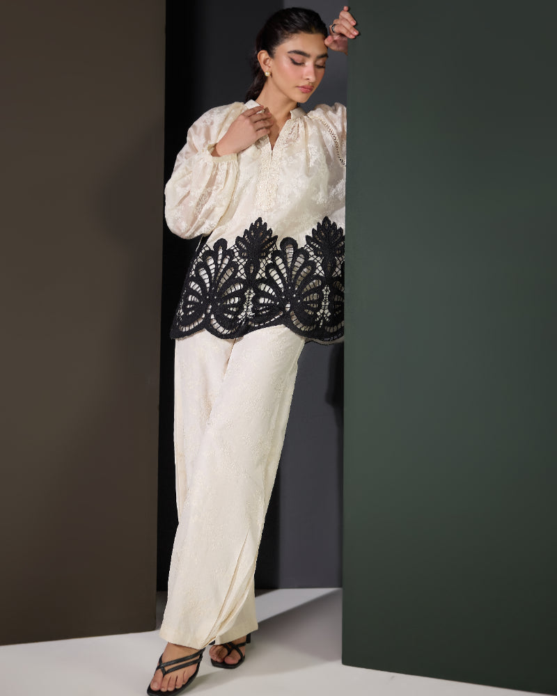 Embellishment: Asymmetric black cutwork embroidery on the daman