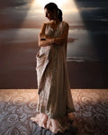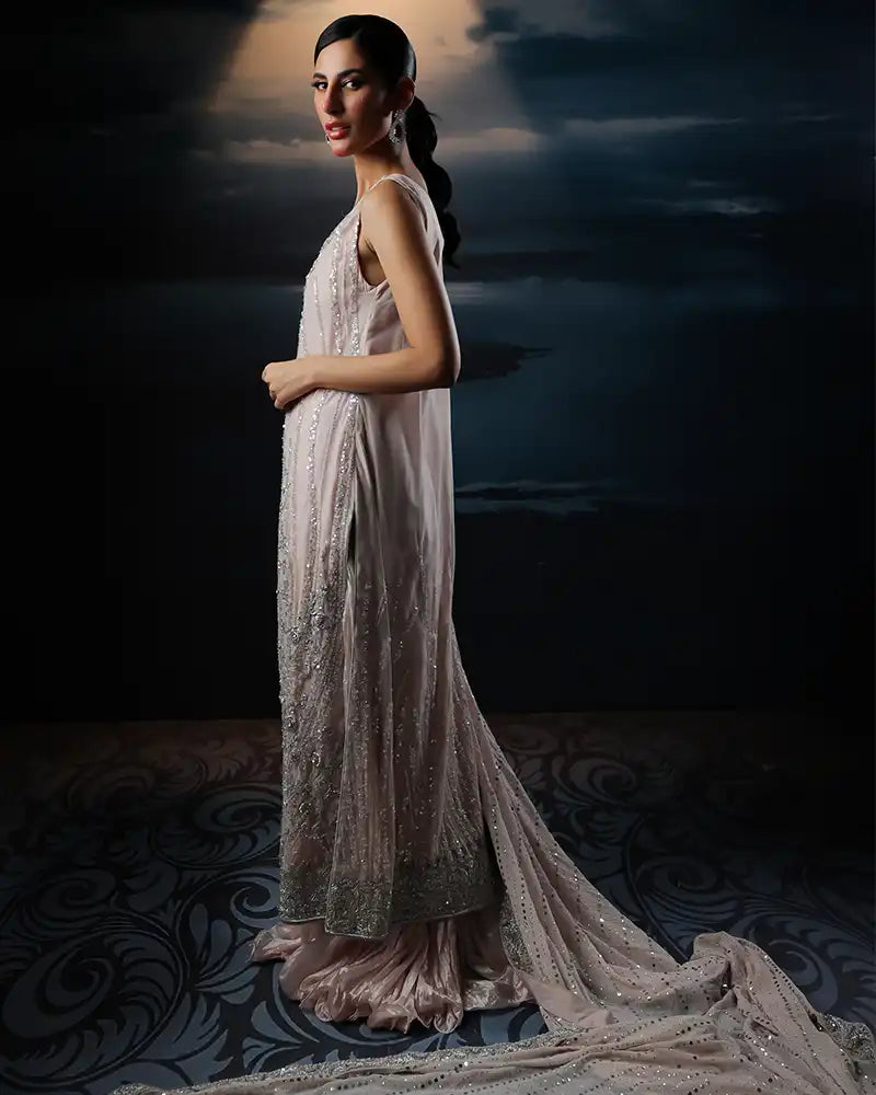 A carnation pink net shirt heaviely worked with fine swarovski crystals, Mukesh and zardoze motives . -Attached silk lining -sleek silk pants. -3 yards kaamdani jorjet duppata with a zardoze border -crushed silver tissue gharara.
