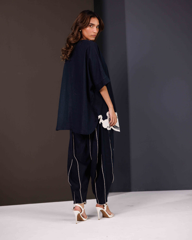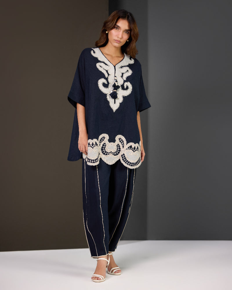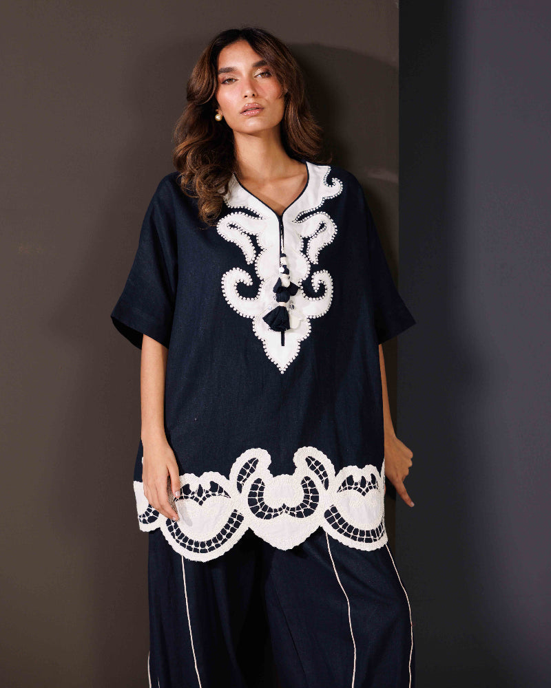 Made from premium Irish fabric, the top features detailed cutwork embroidery in floral and geometric patterns—elevating texture and visual intrigue. The neckline is finished with handmade tassels, adding a hint of playful charm to its refined look.