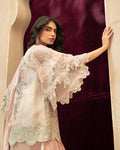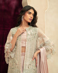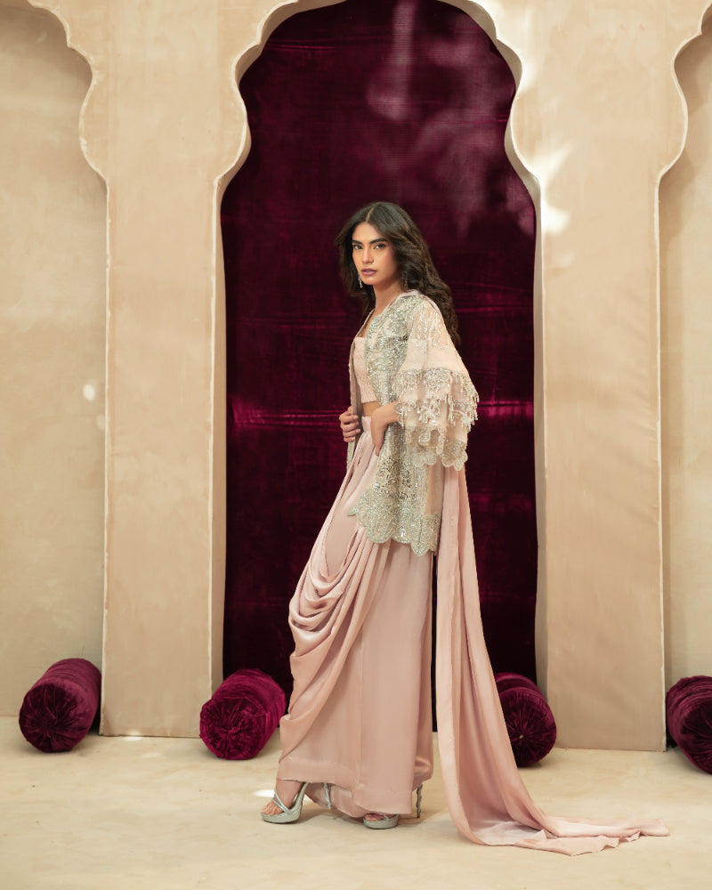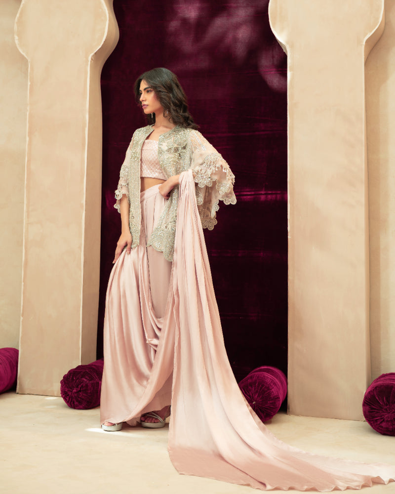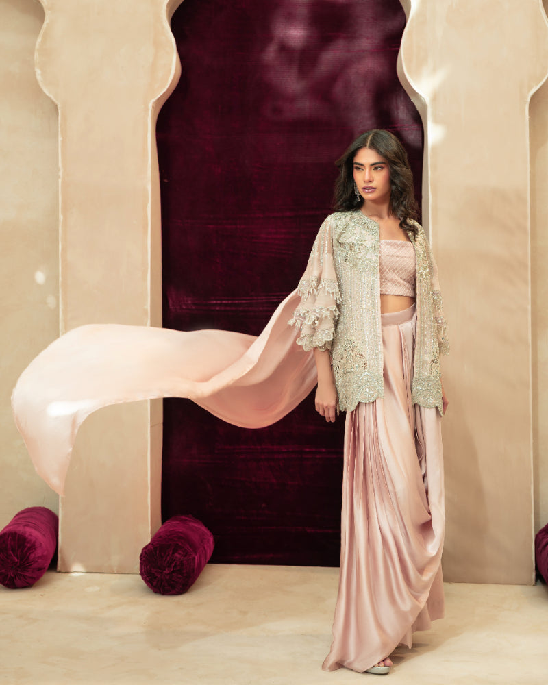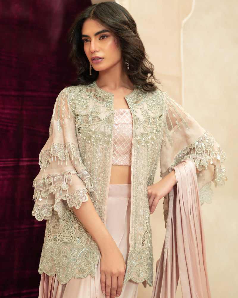 A sheer net short jacket with flowy bell sleeves, designed in a soft pale pastel pink tone. The jacket is delicately embellished with intricate hand embroidery in soft silver and pearl accents, featuring cutwork embroidery and scalloped embroidered detailing along the sleeves, finished with refined borders for an understated couture look. -