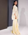 Command attention with the ethereal elegance of Dilara Cape, a luxurious ensemble designed to make a statement. The fully embroidered cape features a rich fusion of hand and machine embroidery, creating depth and artistry in every thread. A delicate lace finish and elegant tassel tie-up add a soft, graceful touch to this standout piece.