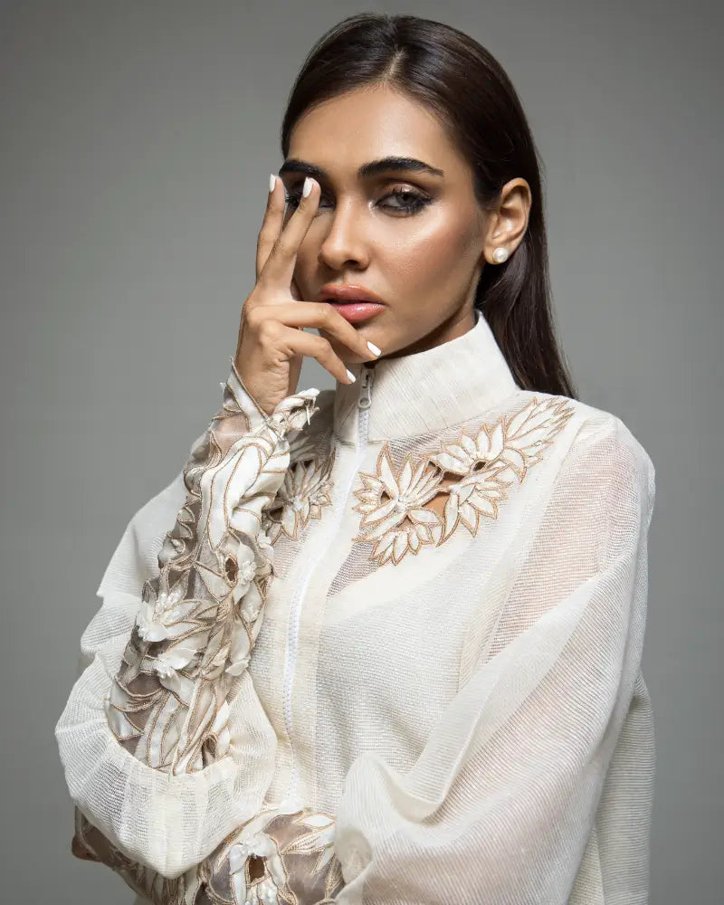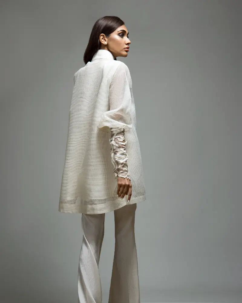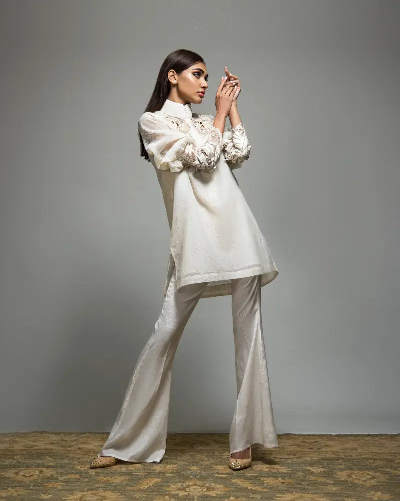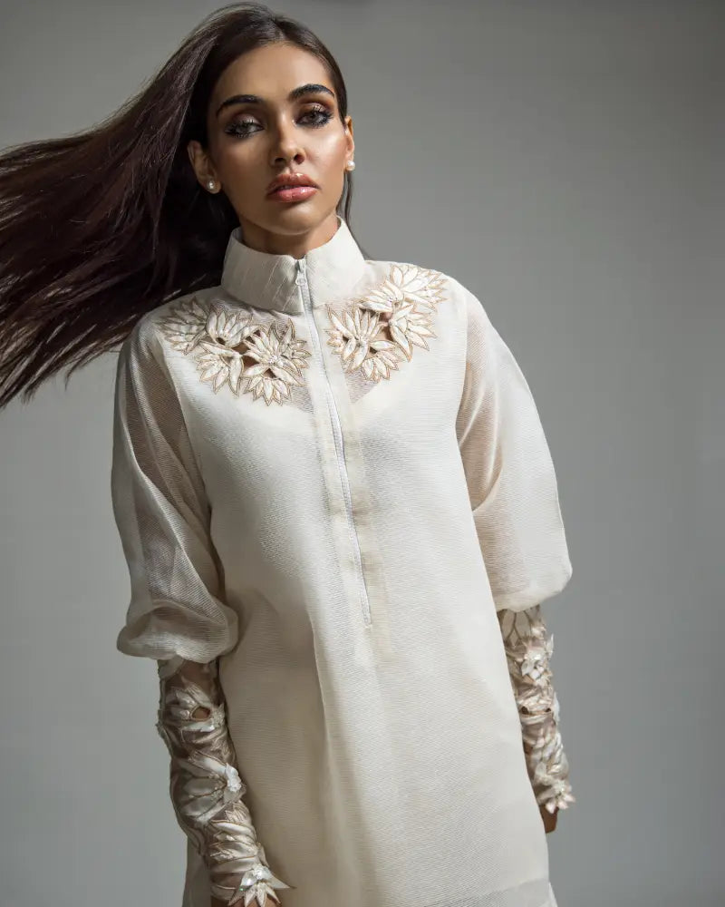 A textured cotton organza tunic with cutwork embroidery along the neckline and exaggerated cuffs.