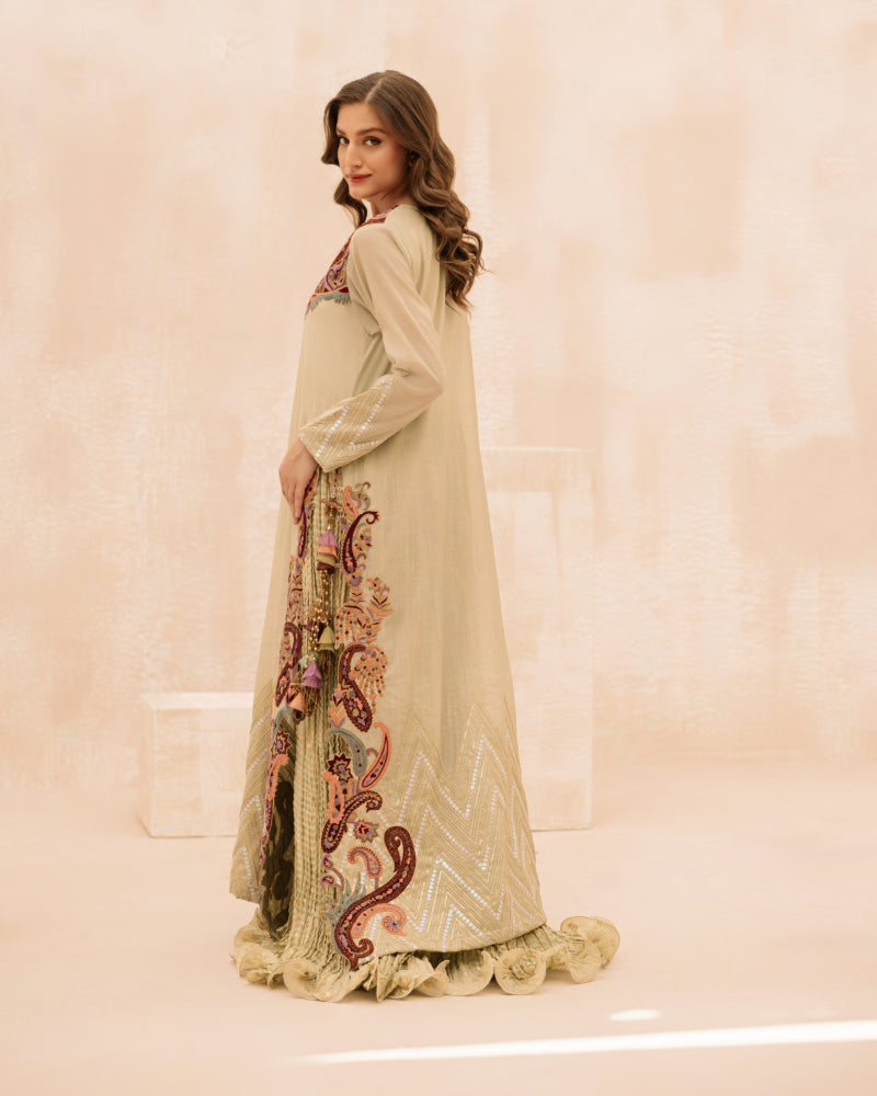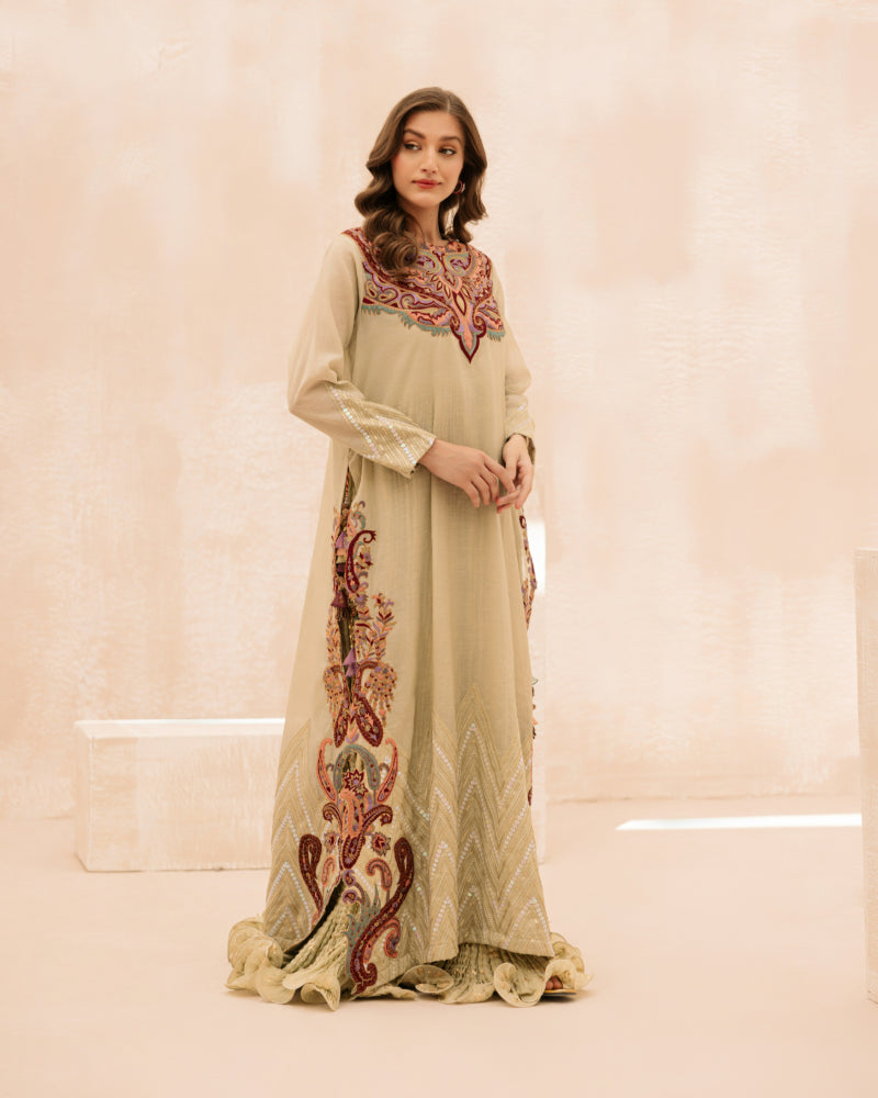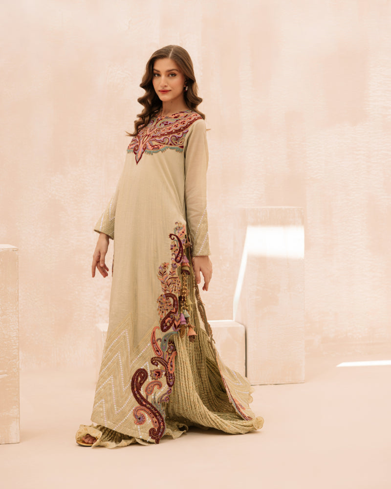 Detailing: Elegant paisley silk thread embroideries gracefully adorning the neckline and side slits of the shirt, blending tradition with intricate craftsmanship.