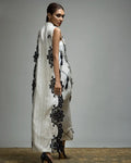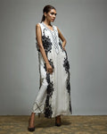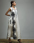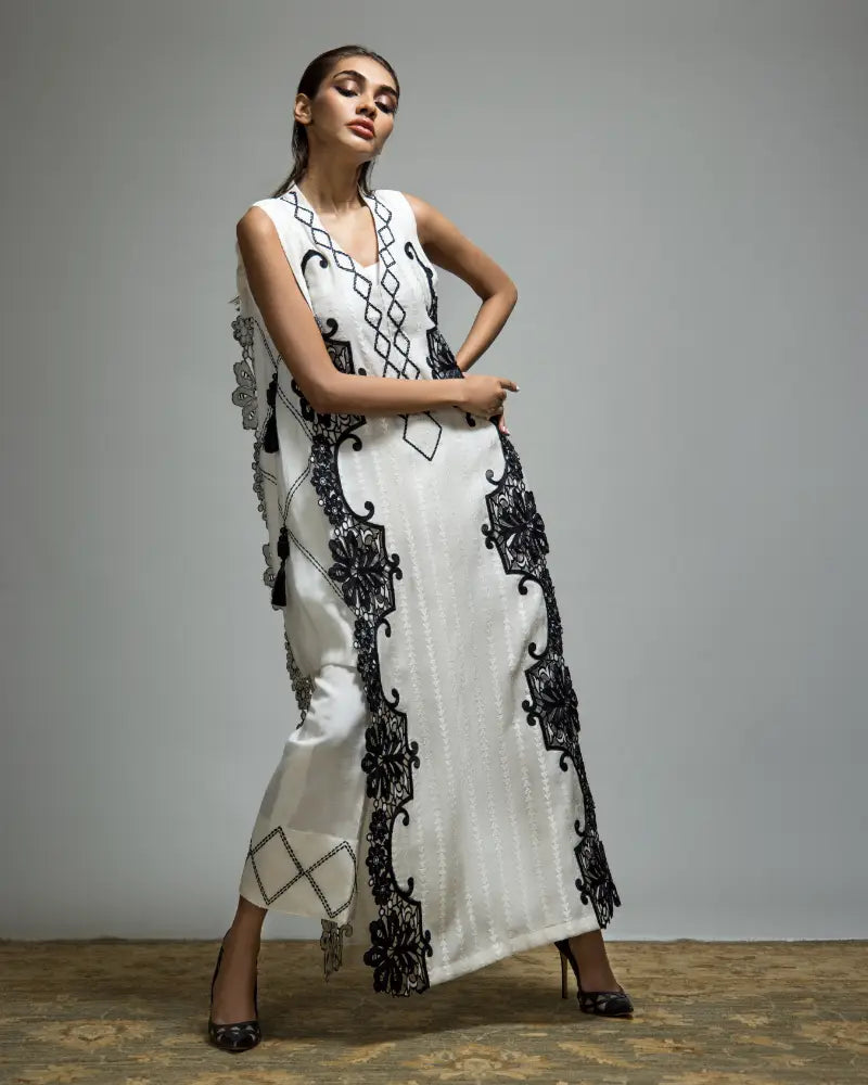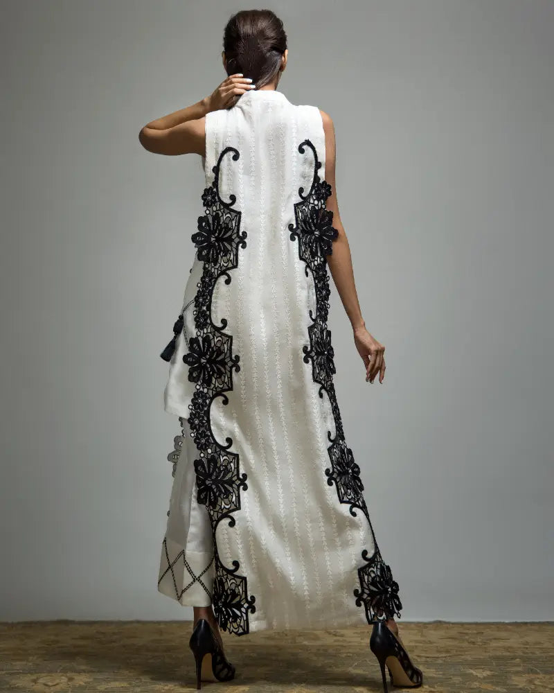 A sleek straight self embroidered viol silk shirt with asymmetric sides . Edges pronounced with cutwork embroidery and neckline matches the embroidery on sides .