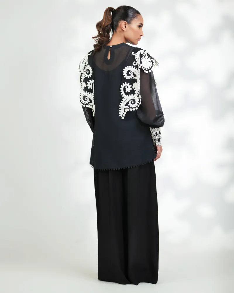 Cut: Boxy short top featuring plaid puff sleeves and delicate lace cuffs