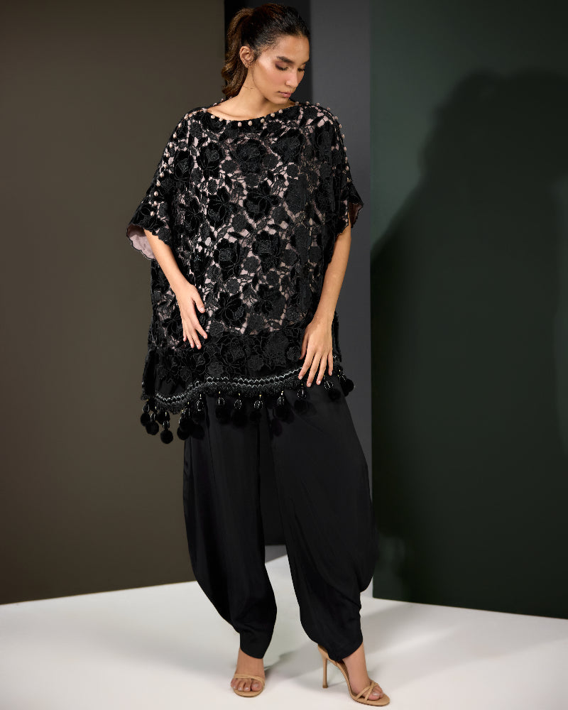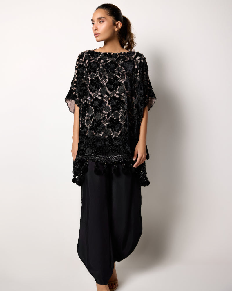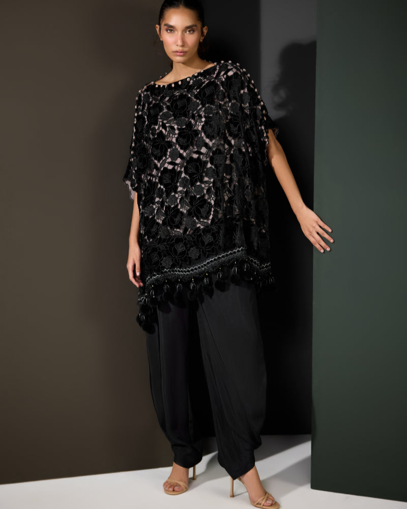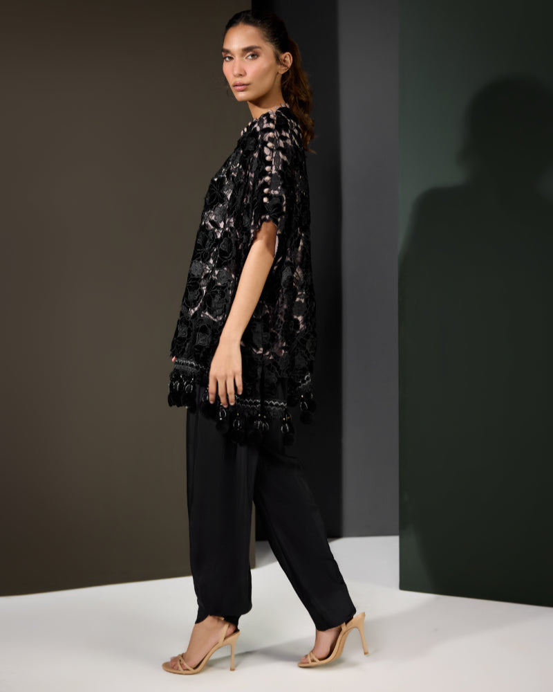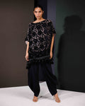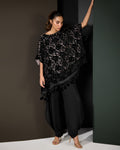 Make a bold impression with Floral Fantasy, a statement ensemble that exudes elegance and modern charm. The black velvet top features rich floral patterns with an artistic overlay design, beautifully finished with delicate lace along the daman for a touch of femininity.