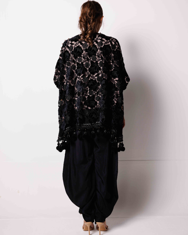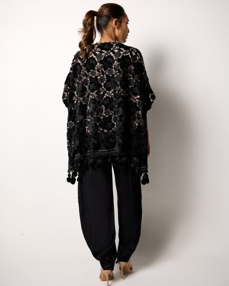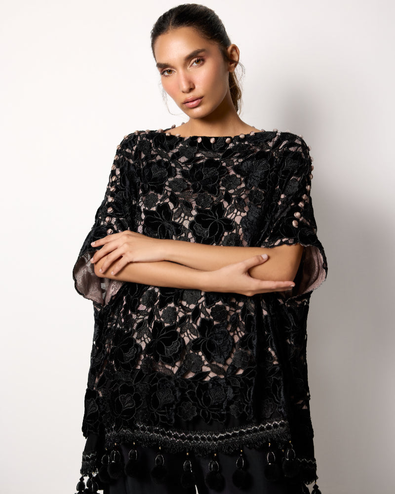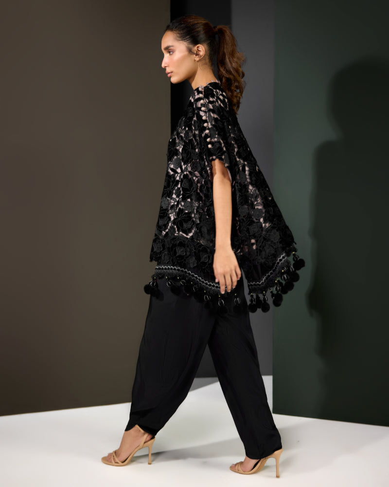 Make a bold impression with Floral Fantasy, a statement ensemble that exudes elegance and modern charm. The black velvet top features rich floral patterns with an artistic overlay design, beautifully finished with delicate lace along the daman for a touch of femininity.