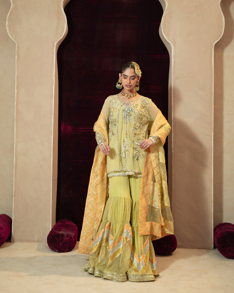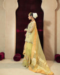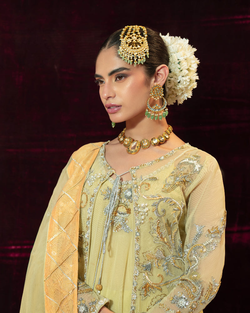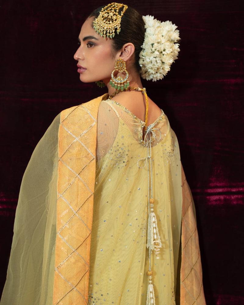 A sheer net jacket in a softly flared silhouette, designed in a fresh lime hue. The piece is adorned with intricate hand embroidery in antique gold and silver tones, featuring delicate floral and vine motifs across the bodice and sleeves. Finished with fine sequins, pearls, shimmering accents, gota detailing, embellished borders, and tassel detailing at the neckline. -