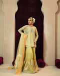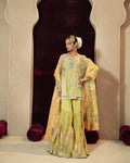 A coordinated gharara that complements the flared jacket silhouette, maintaining fluidity and balance in the overall look. -