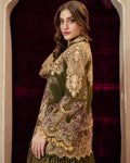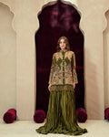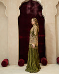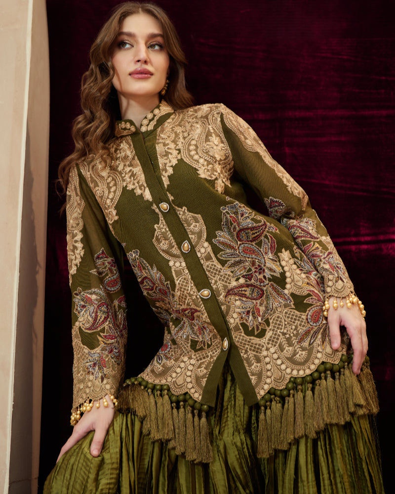 Jacket: Textured cotton net base with silk thread embroidery, appliqué work, and resham fringes