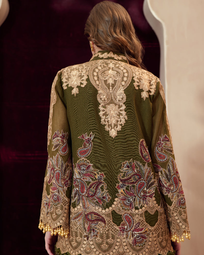A short jacket crafted on a textured cotton net base, featuring a refined short jacket silhouette. The design is detailed with silk thread embroidery and appliqué work, finished with resham fringes for added texture and movement. -
