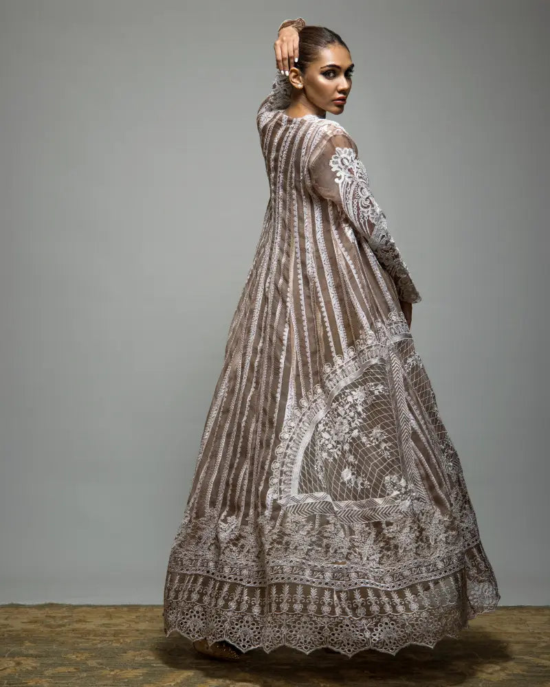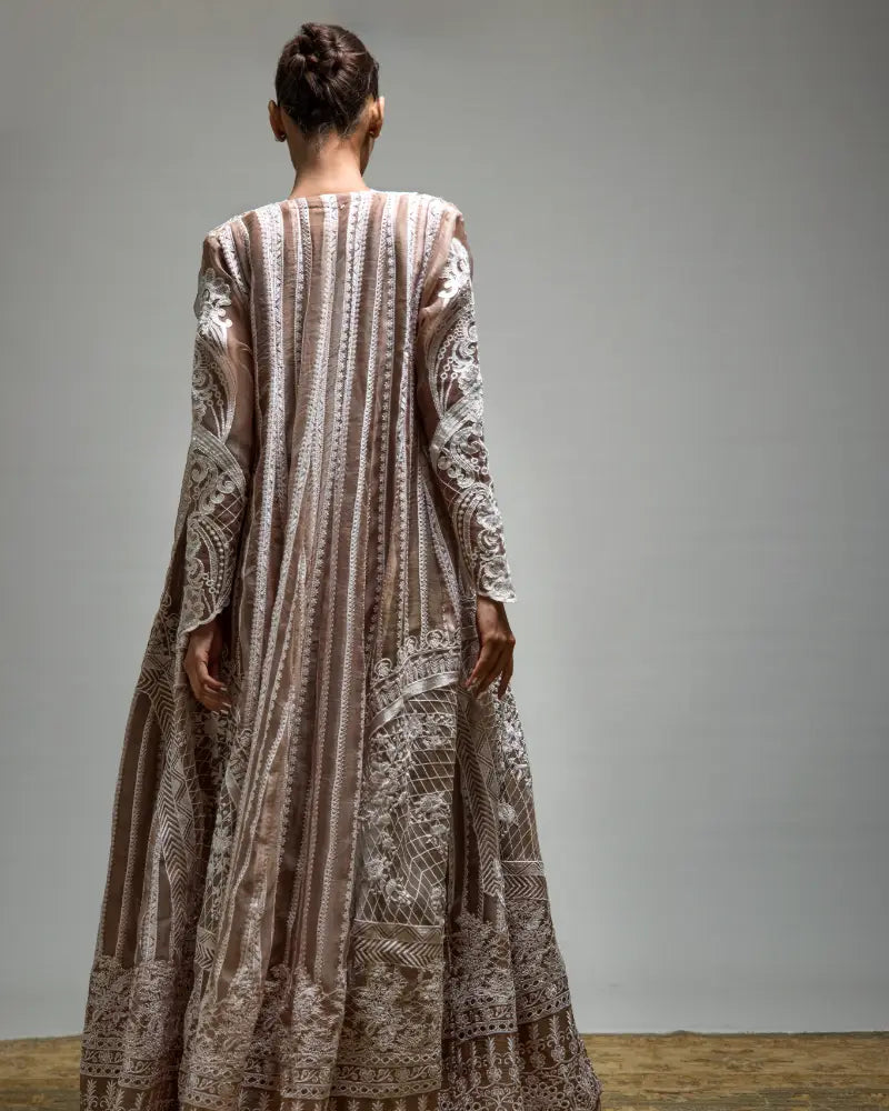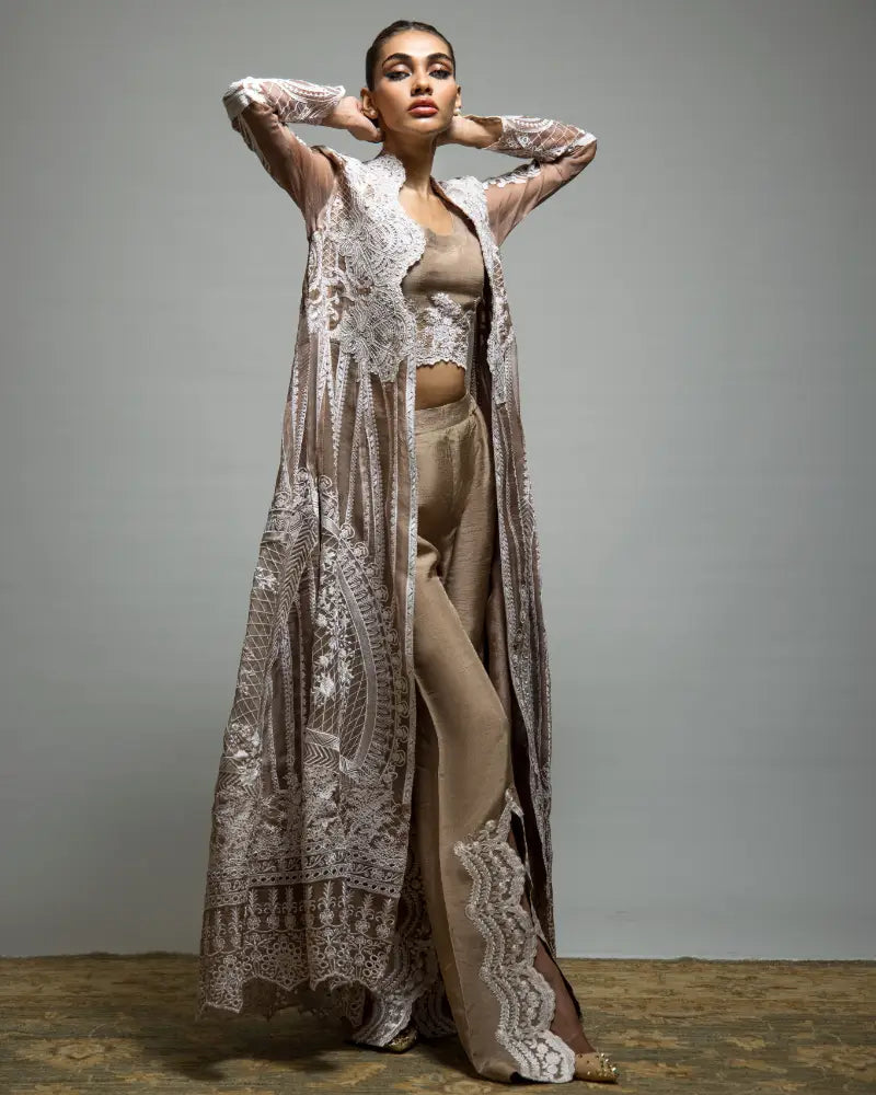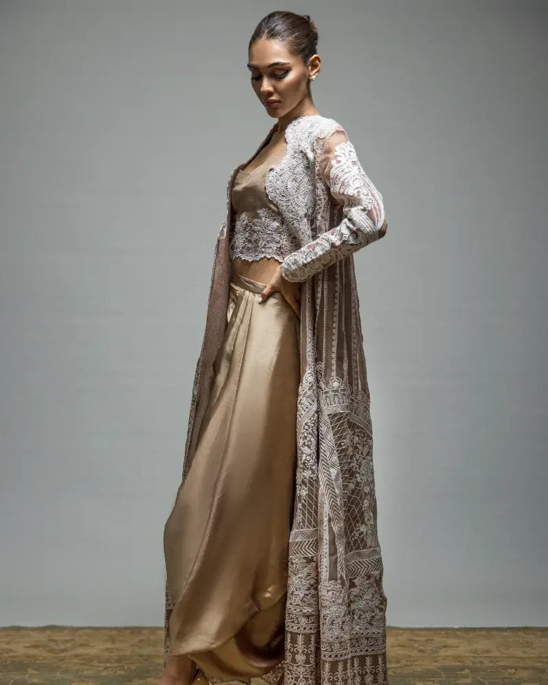 Flowy organza jacket with all over embroidery. Paired with an embroidered bandeau.
