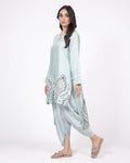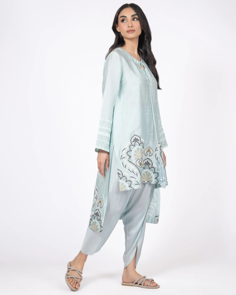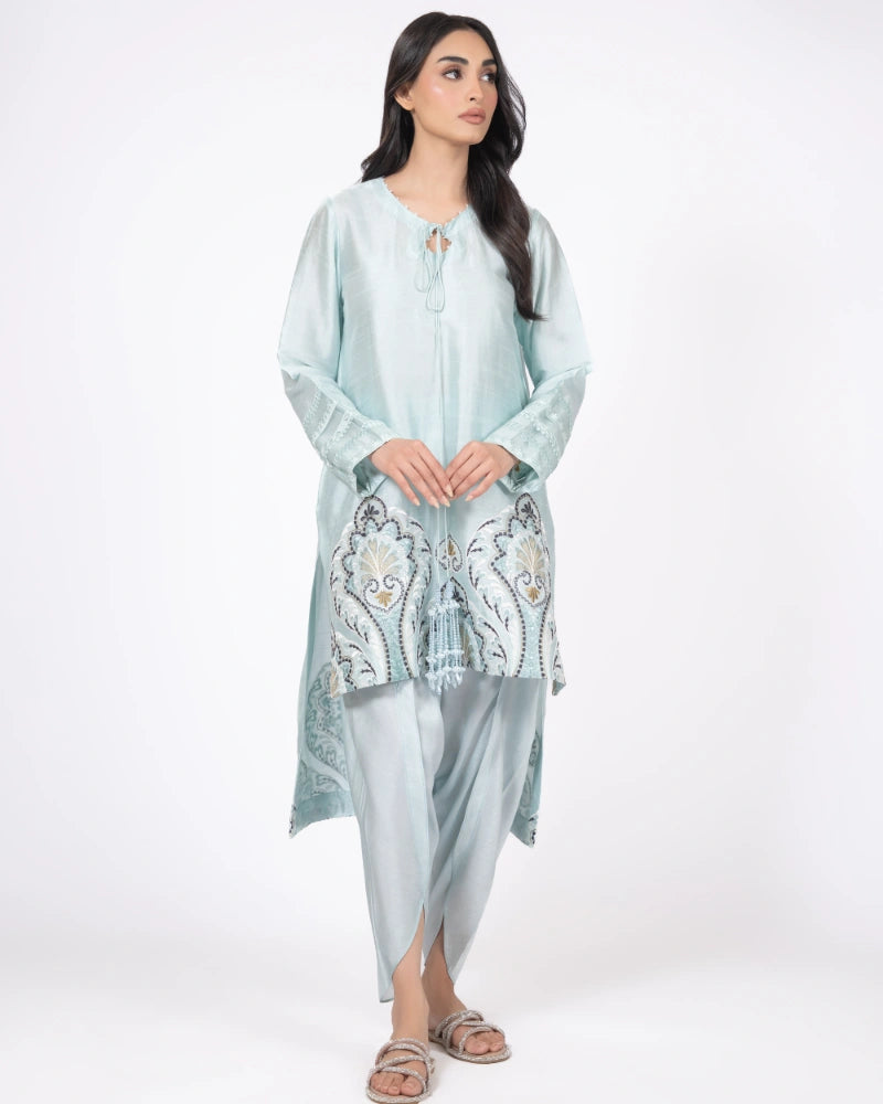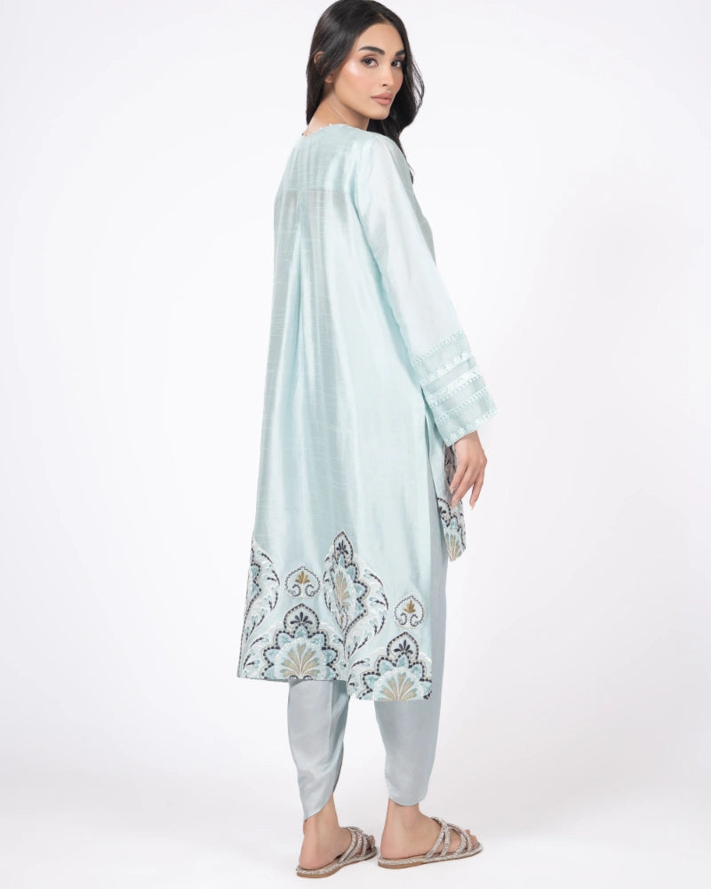 A refreshing aqua ensemble featuring a straight shirt adorned with intricate threadwork and modern paisley motifs along the hem. The sleeves are finished with embroidered borders, while the look is completed with a plain tulip shalwar for an understated, elegant finish.