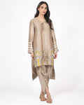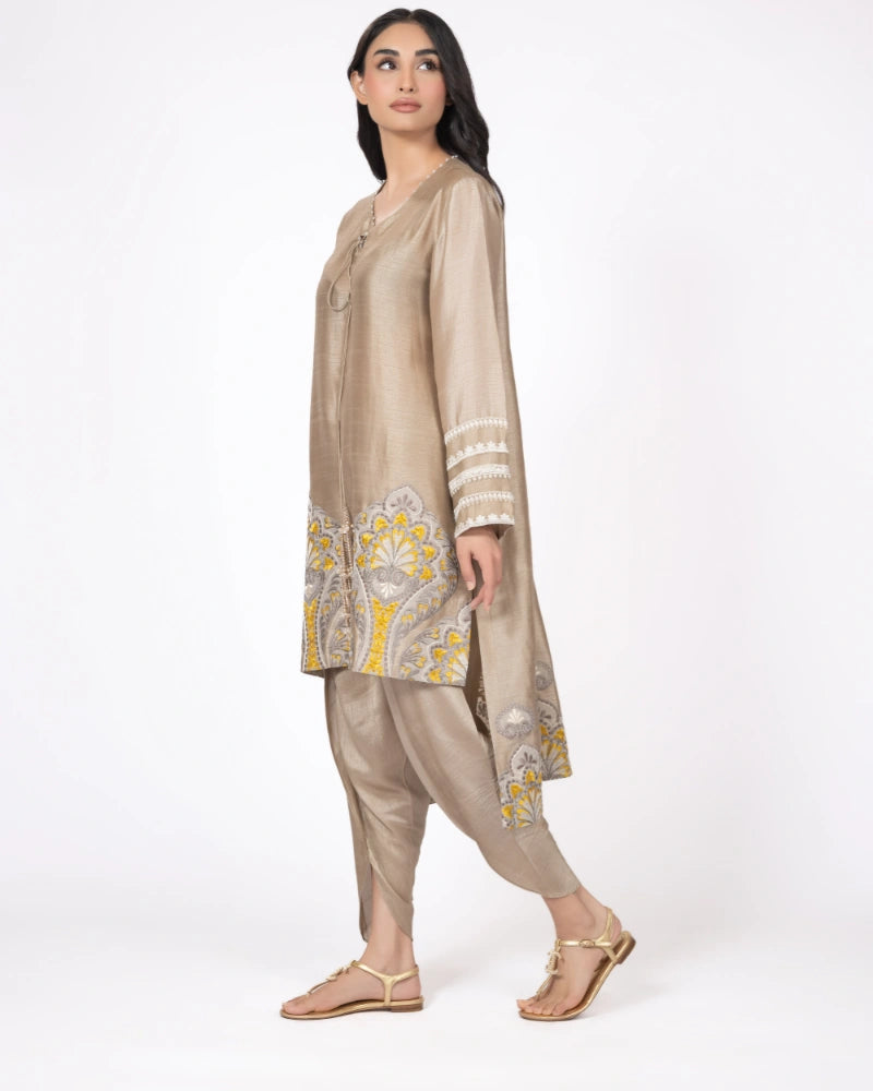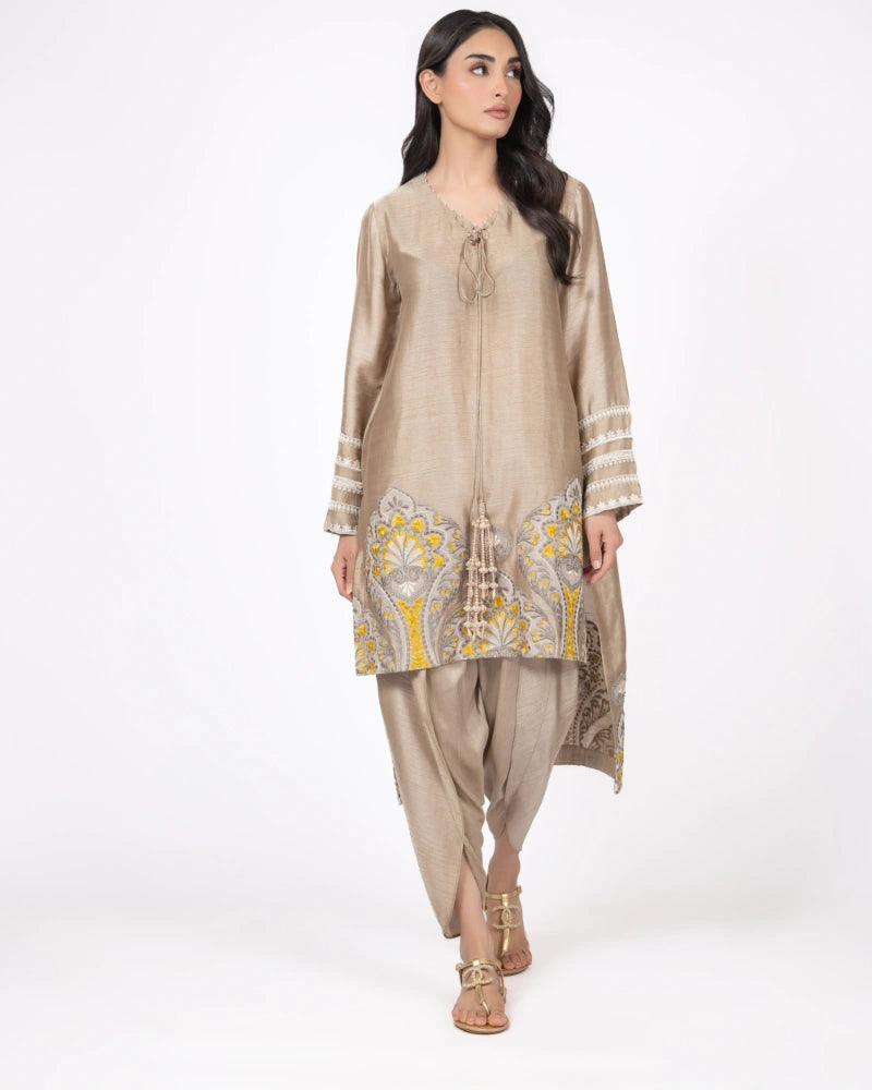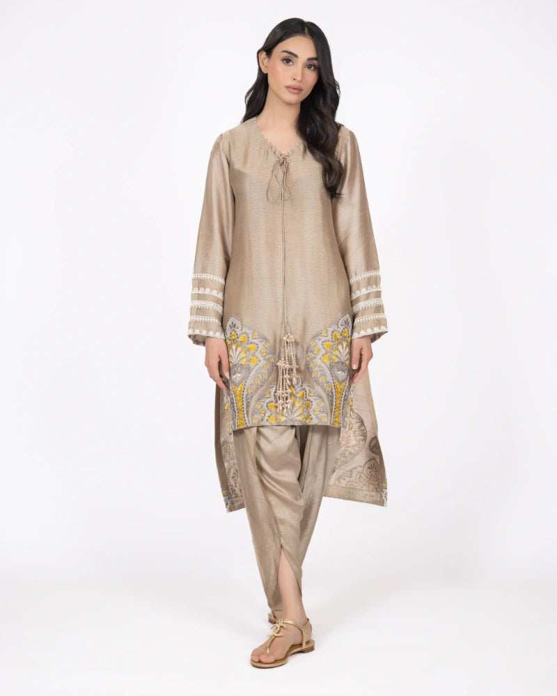 An elegant taupe ensemble featuring a straight shirt adorned with intricate threadwork and modern paisley motifs along the hem. The sleeves are finished with embroidered borders, while the look is completed with a plain tulip shalwar for an understated, elegant finish.
