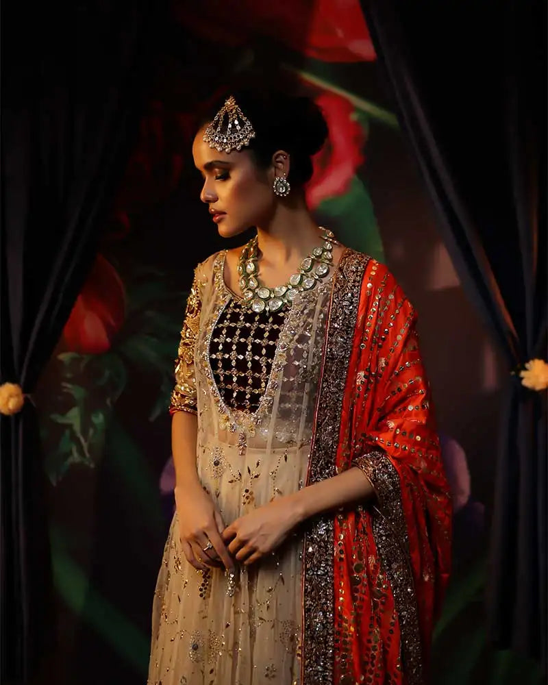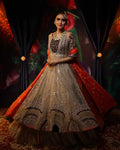 Flowy net paishwaas cladded with ganga jamni kaamdani. The grand ghaira is heavily worked with rich velvet appliques and zardozi dori. The ethnic look is complimented by elbow length zardoze sleeve enhanced with kundan and gota work. Velvet choli with gota work (fabric can be changed to silk). Lame' tissue crushed ghera gharara. Pure jamavaar neon orange cladded with a heavy sikka kaamdani & a heavy 4 side zardoze border.