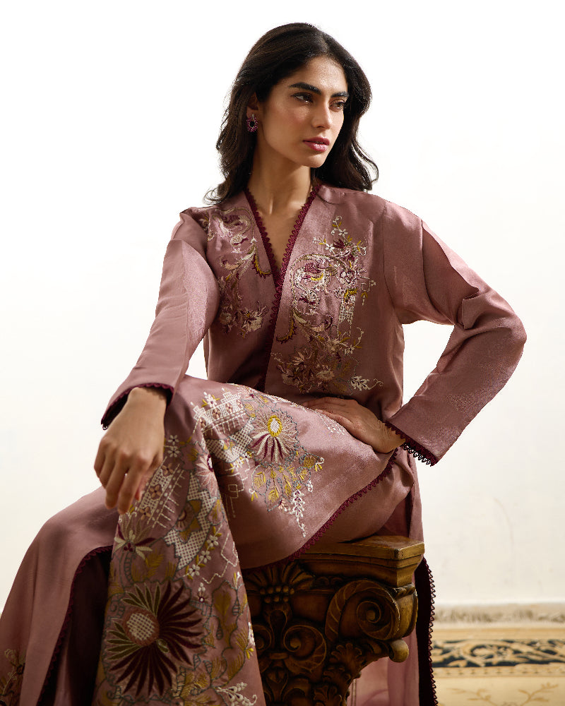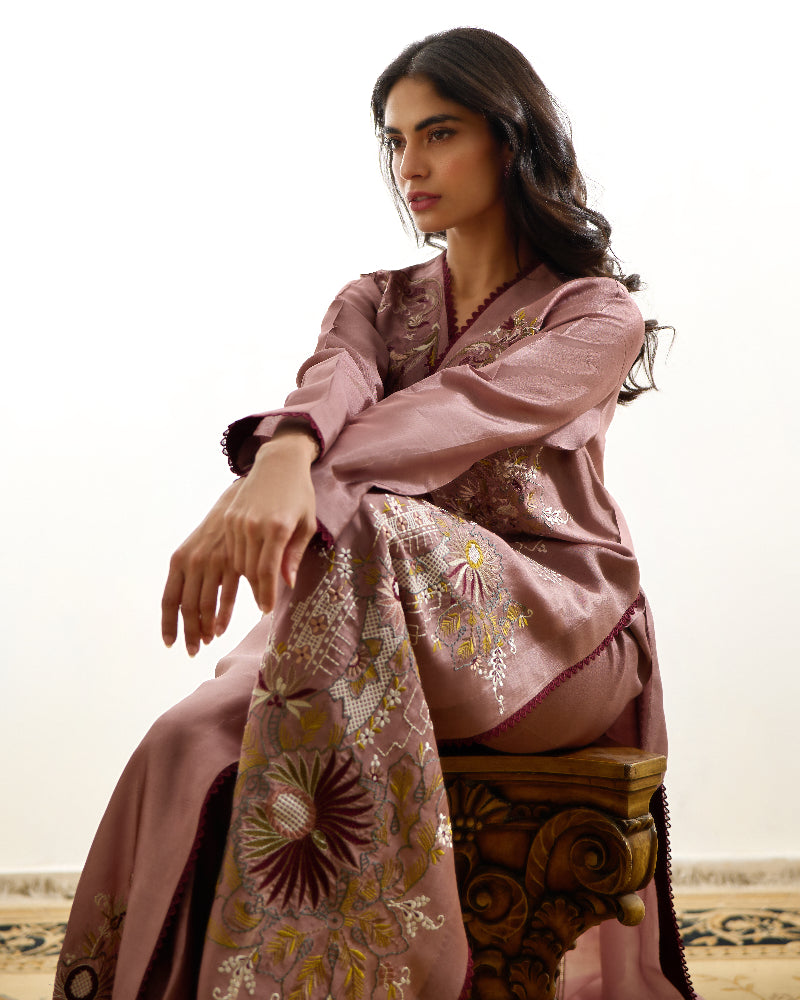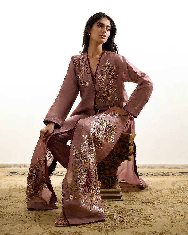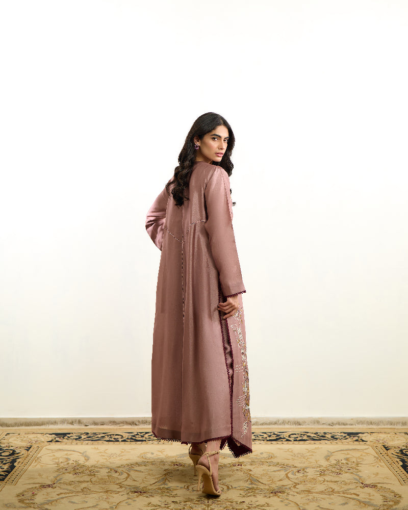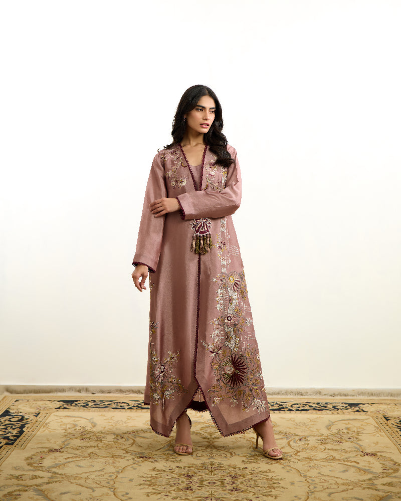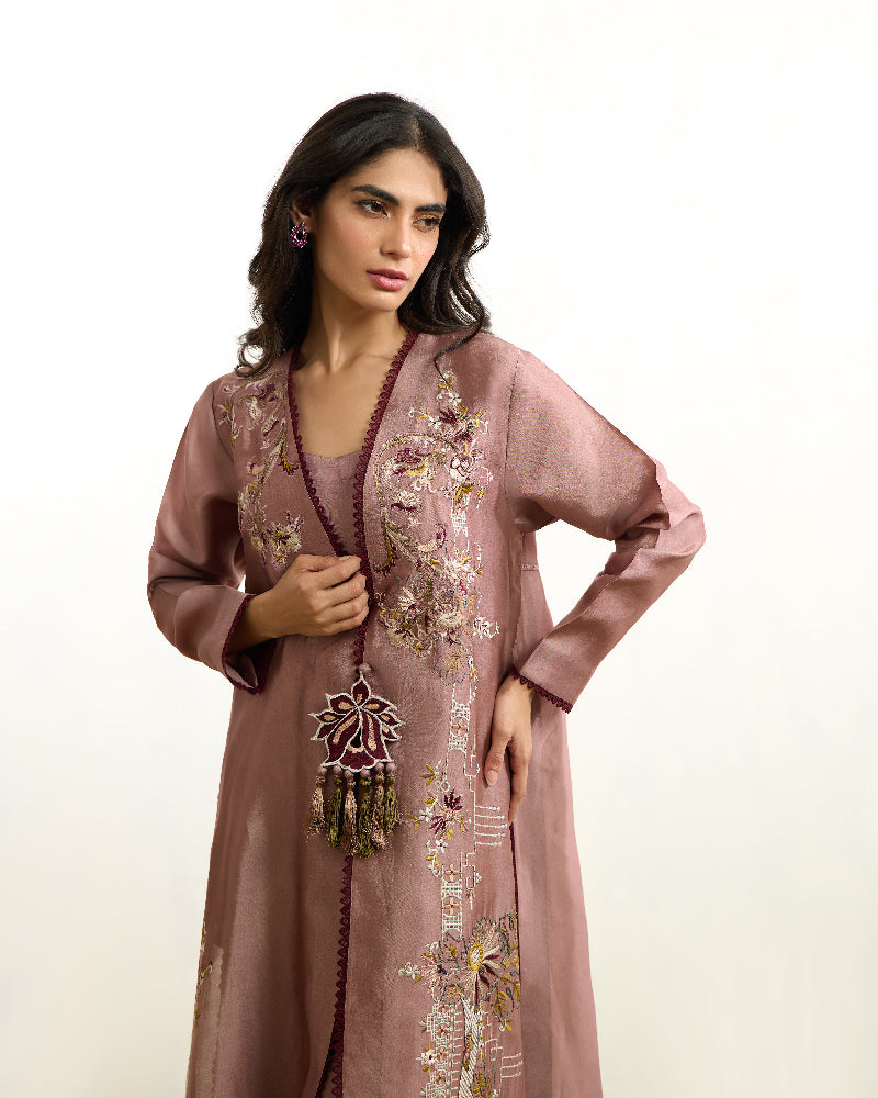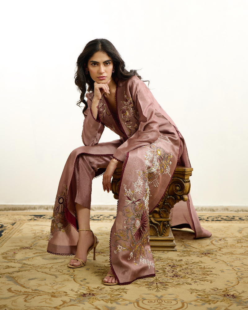 A front-open asymmetric A-line shirt layered over a short undershirt, paired with straight pants. Crafted in an elegant mauve taupe, this piece features intricate multicolour silk thread embroidery inspired by traditional Chinese artistry. Finished with delicate detailing and handcrafted tassels, it perfectly combines contemporary style with timeless craftsmanship.