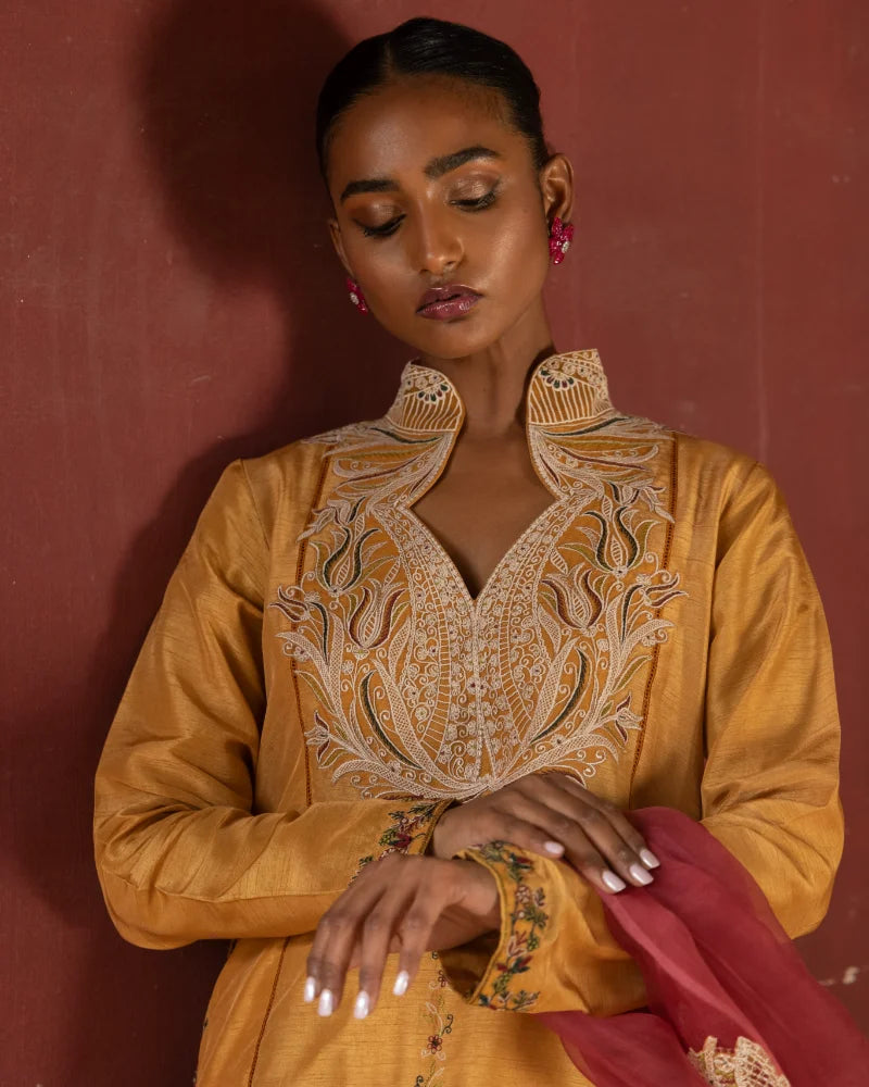 A gracefully modest kurta-style ensemble, elevated by intricate embroidery.