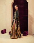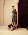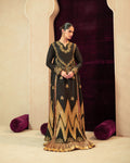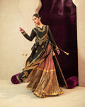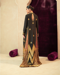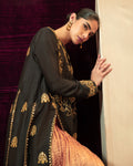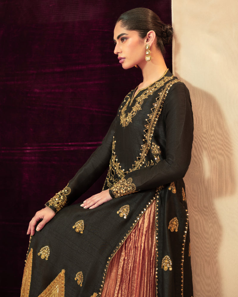 A panelled, sleek shirt featuring an attached under-layer of banarsi silk crushed flare for added volume and drama. Finished with full-fit sleeves. Crafted in a timeless blend of black and rich gold, intricately embroidered with tilla and elevated with detailed zardoze handwork. Cutwork embroidery is also incorporated for a refined, artisanal finish. Features hand-made tassels on the sides, and full-fit tapered sleeves edged with an embroidered border. The inner crushed silk layer falls fluidly, creating a beautifully grand, statement feel with every movement.