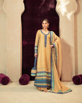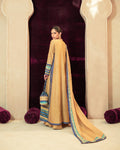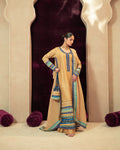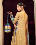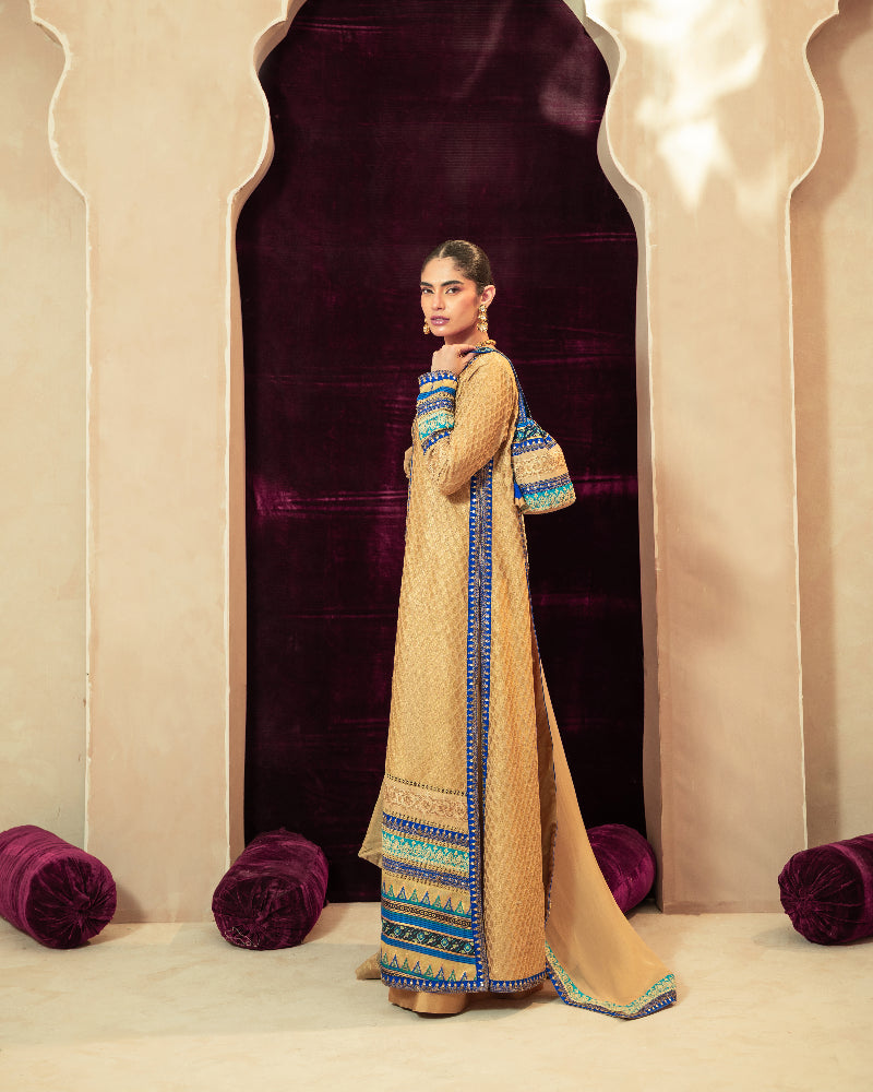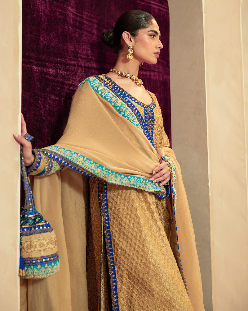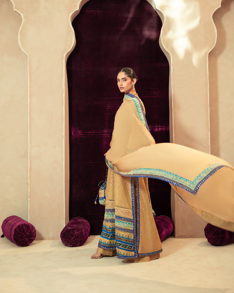 Custom-made embroidered linen silk in a long, flowy A-line kaaftan shirt, paired with flowy wide-leg pants and a long 3-yard dupatta. A golden beige ensemble elevated with electric blue and deep turquoise marori embroidery, highlighted with a hint of deep gold, and finished with vibrant screen-printed borders for a striking, contemporary contrast.