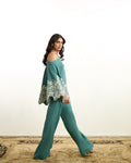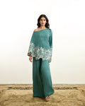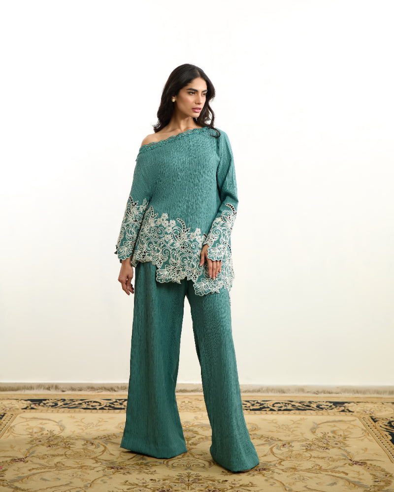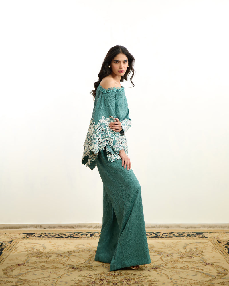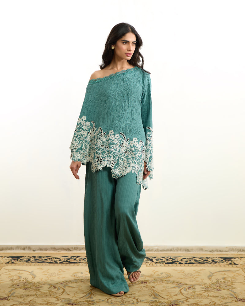 An asymmetric top crafted in textured crepe silk, featuring a cape sleeve on one side and a full-length fitted sleeve on the other, paired with wide-leg palazzo pants. Rendered in sea mist green, it is adorned with intricate cutwork embroidery along the hem for a delicate yet bold finish. The fluid silhouette and refined detailing offer an effortlessly elegant look, perfect for understated sophistication.